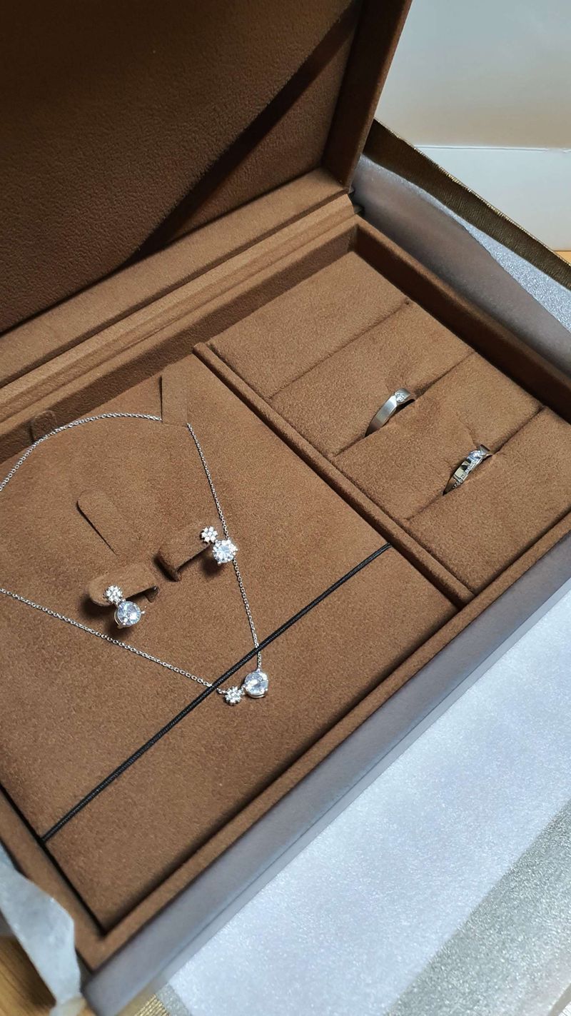 상담 당시에는.반짝반짝한 샵에 눈 돌아가서 사진 못찍고 완성 후 받으러 갔을때는 너무 오랫만이라(엄청 일찍 계약하고 첫 방문 후 7개월만에 물건받으러 간 사람 요기있습니다...) 기억에서 가물가물해졌던 우리 반지보면서 다시 하트 뿅뿅되느라 역시 사진 못찍고 집에와서야 정신차리고 사진 찍었네요 ㅎㅎㅎ고급진 예물함에 넣어두니까 서비스로 주신 실버 셋트도 캐럿 다이아같아보이는 콩깍지 ㅎㅎㅎ 디자인 : 추천♥ 평소 업무때문에 반지를 못끼다 보니 혼수마켓 상담 시 두껍거나 넓은 반지가 너무 불편하고 싫었어서 방문시 담당해주신 본부장님이 제 취향을 찾아주시느라 매우 고생하셨는데 결과적으로 심플하면서도 평범하지 않은 만족스러운 디자인을 찾게 되었어요! 품질 : 추천♥ 취향때문이였는지 두개 다 1부 다이아에 제껏만 참깨다이아 추가했는데도 생각했던 예산보다 저렴하게 잘 맞춘거 같단 생각이구요! 무엇보다도 딱 받아봤을때 우와아!하고 박수쳤네요 ㅎㅎㅎㅎ 서비스 : 추천♥ 우선 혼수마켓 상담 시 상담실장님의 솔직하게 맞고 아니고를 확실하게 말씀해주시는 덕에 홀린듯 계약했는데 방문시 담당해주신 본부장님이 까다로운 제 취향 찾아주시느라 정말 고생하셨어요 ㅜㅜ그럼에도 몇번을 샵을 돌아다니시면서 끝까지 잘 챙겨 주셨구요 서비스로 챙겨주시는 혼주 브로치와 귀찌는 사실 생각지도 못하게 블링블링 너무 예뻐서 양가 어머니들 너무 좋아하셨어요!!!