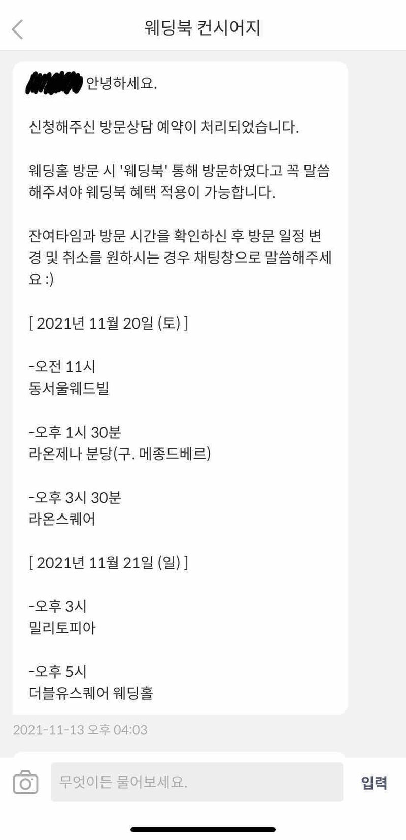 원하는 웨딩홀과 원하는 방문 날짜를 말씀드리면, 가능 여부도 빨리 확인해주시는 편이시고 방문 동선 및 시간도 엄청 잘 짜주셨어요!! 웨딩홀 투어하고 너무 적당해서 약간 놀랐어요 ㅋㅋ 너무 빠듯하지도, 너무 시간 뜨지도 않는 숨 돌리기 적당한 여유!!! ㅎㅎ 업체 : 추천♥ 웨딩홀 예약은 비대면 상담으로 하면 정말 편리한 것 같아요!! 가격 : 추천♥ 웨딩홀은 가격적인 면에서 워크인/웨딩북 차이가 없다고 알고 있어요. 하지만 웨딩북은 캐시백이 되니까 🥰 서비스 : 추천♥ 무엇보다 웨딩홀 방문 동선과 시간을 잘 짜주셔서 너무 편했어요!!!