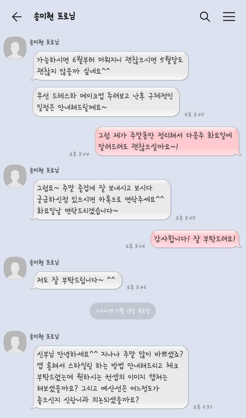 어플만 일단 받아놓고 이거저거 눌러보던차에 프로님께서 카톡으로 먼저 연락이 닿았습니다! 혼자 준비했다면 아직도 멍~ 하게 있었을텐데 프로님 덕분에 일사천리로 해결되고 있네요ㅜㅜ 원하는 날짜에 원하는 웨딩홀로 예약했고 스드메, 예물까지 끝났다니.. 넘넘 감사한 웨딩북❤ 업체 : 추천♥ 웨딩홀, 스드메, 예물까지 마쳤고 곧이어 예복과 부케, 웨딩카 등 더 이용할 예정입니다! 가격 : 추천♥ 타업체 견적을 내보지않아 모르겠지만 편리하게 결혼준비를 한다는것 자체에서 너무 만족스럽습니다! 더 비싸다고 해도 이렇게 편하게 준비하게 되어 합리적이라고 생각이 듭니다 서비스 : 추천♥ 막막한 제게 한줄기 빛과 같은 프로님..👍