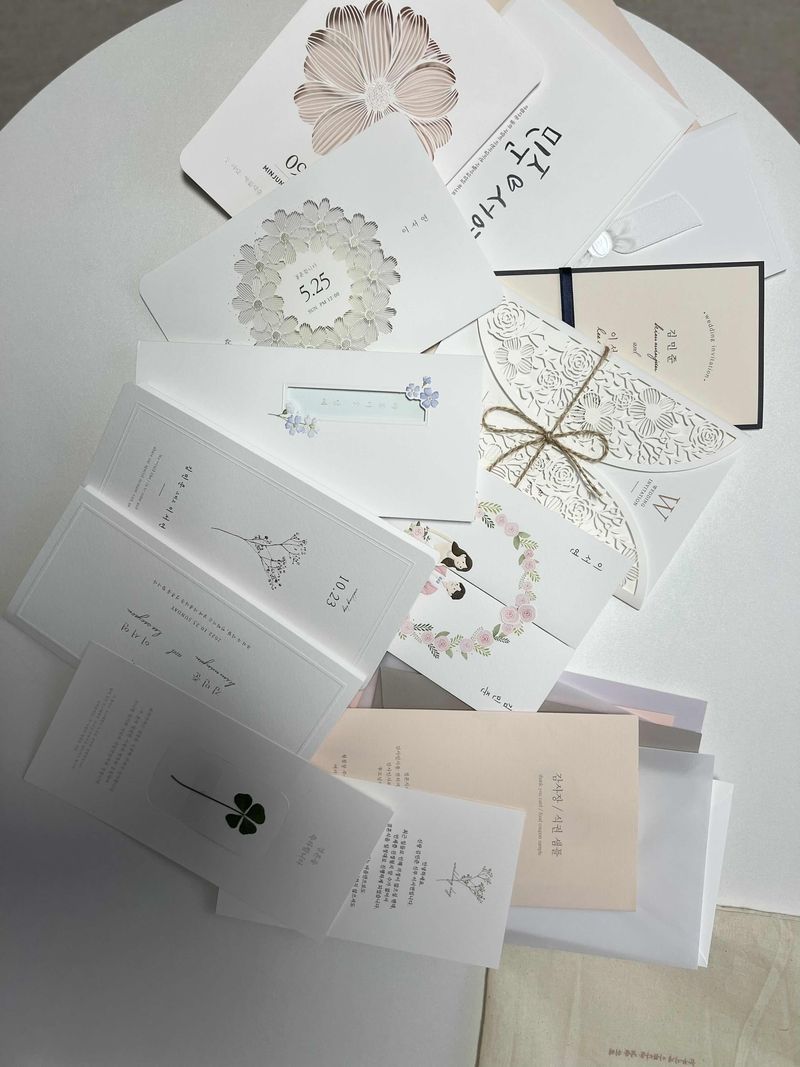 많고 많은 업체 중에 제일 취향인 디자인이 많은 것 같아서 샘플 받아봤는데, 포장도 예쁘게 와서 기분이 좋았어요. 근데 샘플신청 한 것 말고 사이트에 있는 다른 디자인 2개가 갑자기 더 끌려서 ㅋㅋㅋ2개 중에 뭘로 픽스할지 고민 중입니다! 디자인 : 추천♥ 여러 업체들 중에 제 취향에 맞게 깔끔하고, 세련된 디자인이 많아서 좋았습니다! 가격 : 추천♥ 샘플 받아보니 재질도 고급스러웠고, 레이저 컷팅이나 금박 같은 여러 공정이 들어가서 많이 비쌀까 싶었는데 생각보다 가성비가 좋다고 느껴졌어요! 서비스 : 추천♥ 샘플10종 골라서 무료로 받아볼 수 있어서 좋고, 네잎클로버가 반겨줘서 기분이 좋았습니다! 샘플후기 쓰면 할인혜택도 받을 수 있습니다!
