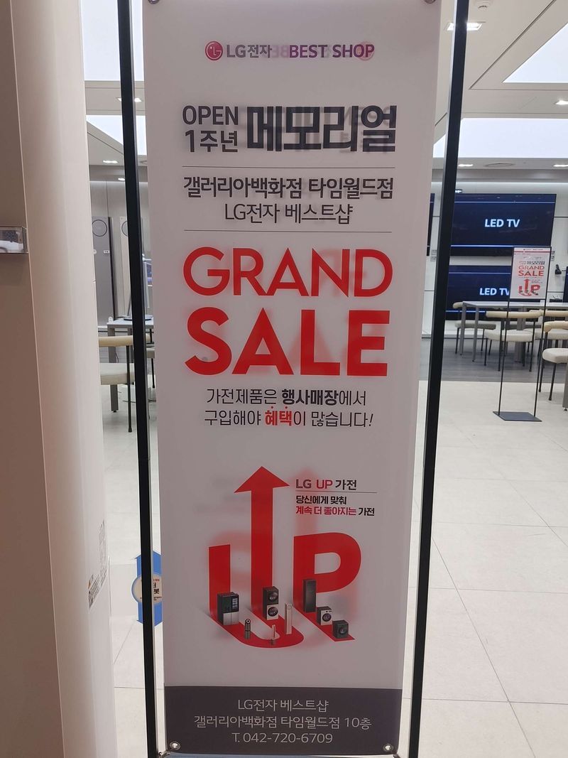 매장이 전체적으로 깔끔하고 넓고 직원들도 친절하고 좋습니다ㅎㅎ 상품 : 추천♥ TV 냉장고 워시타워 스타일러 청소기 에어컨 이렇게 구매하였습니다. 그런데 처음에 봤던 모델에서 LG전자 갤러리아타임월드점 전상환명장님을 만나 LED TV에서 올레드로 노크온x오브제냉장고에서 얼음정수기냉장고로 추천받아 구매완료하였습니다^^ 가격 : 추천♥ 하이마트나 일반대리점에서 비교견적 후 방문하였는데 제품 설명도 하나하나 자세히 설명해주시고 생각도 못한 제품추천도 받았는데 너무 만족한 견적이 나왔습니다. 할인전 2천5백만원정도였는데 최종혜택가는 1천7백만원정도로 복잡한 조건없이 구매하였습니다.ㅎㅎ 서비스 : 추천♥ 일단 매니저를 누굴 만냐느냐에 따라 제품추천이 달라지는걸 알았고 다행이도 좋은 명장님을 만나 10년이상 사용할 신혼제품 좋은가격에 잘 구매한 것 같아요!! 지금 리뉴얼1주년 행사라서 혜택이 정말 좋더라고요. 강력 추천드립니다!^^