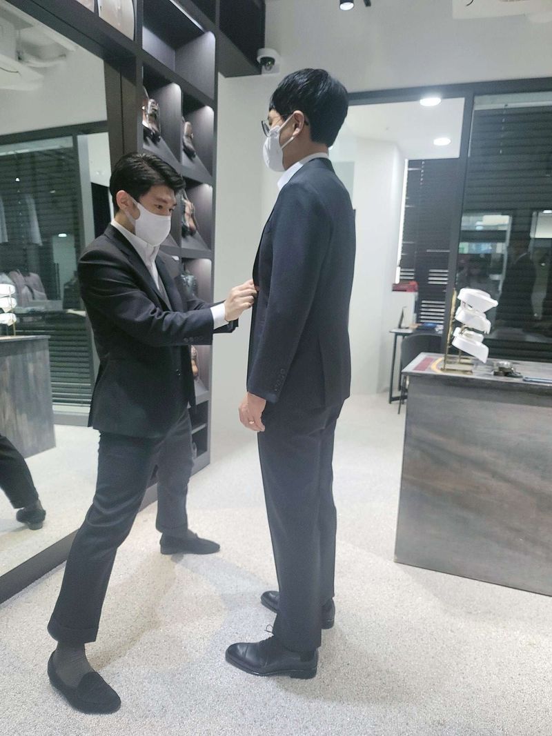 최종 가봉 해주시는 모습입니다. 핏도 딱 맞게 떨어지고 마음에 듭니다. 촬영도 잘 마치고 이제 본식만 남아있는데 예쁘게 입고 본식 진행 할 수 있을 것 같습니다. 감사합니다 ㅎㅎ 상품 : 추천♥ 이태리원단 챠콜 색상 / 셔츠,바지,베스트,자켓,수제화 구성으로 진행 하였습니다. 가격 : 추천♥ 예상했던 가격과 비슷했습니다. 품질도 신랑이 만족하고 기성복보다 어깨 움직임이 편하고 입었을때 착용감도 딱 떨어지고 핏도 마음에 들어합니다. 서비스 : 추천♥ 처음 상담하러 갔을때도 친절하게 설명해주시고 헷갈리는 부분은 직접 보여주시면서 설명 해주셔서 좋았습니다.