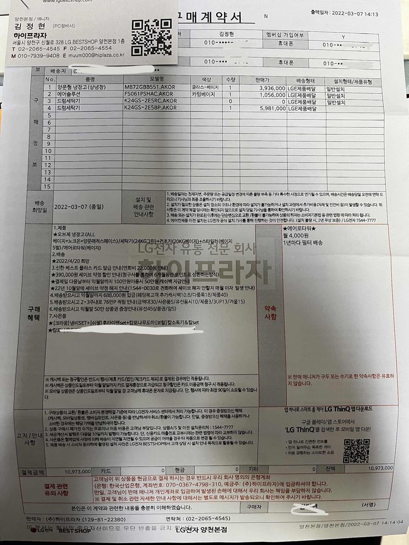 가양본점에서 프로모션 문자가 와서 가보려다가 양천본점이 더 낫다고 해서 가보자하고 일요일 오후에 방문 했습니다. 사실 삼성만 생각하고 있었던 터라 걍 구경이나 하려고 갔다가 매니저님이 아주 조리있고 친절하게 하나하나 따져주셔서 계약하고 왔어요 이렇게 저렇게 조합 해서 최적의 가격 조건 맞춰 주시고 신한카드 프로모션 추가적용돼서 좋은 견적에 살 수 있었습니다~ 캐시백을 앞으로 잘 챙겨야겠지만요 ㅎㅎ 상품 : 추천♥ 오브제 냉장고 세탁기 건조기 스타일러 에어로타워 가격 : 추천♥ 총 결제 1079만원 체감가는 800만원대였습니다 서비스 : 추천♥ 김정현 매니저님 차분하고 조리있고 친절하게 잘 해주셨습니다