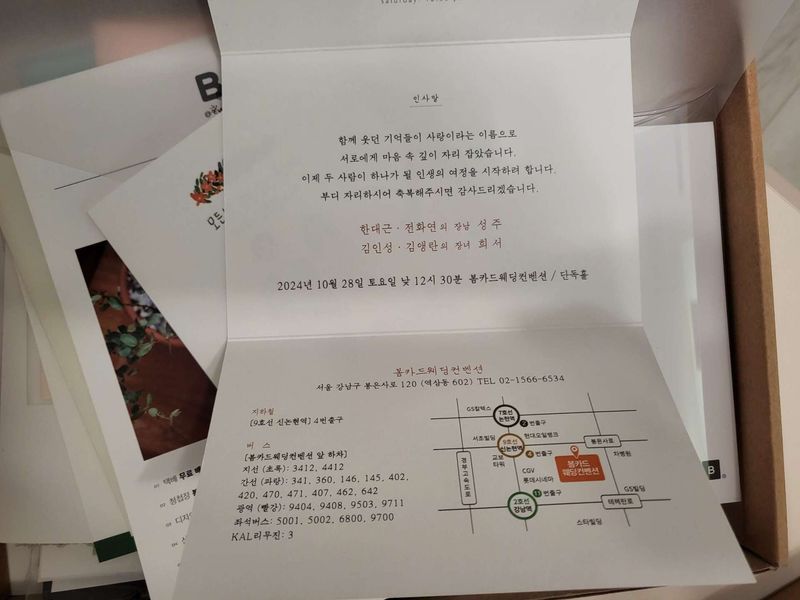 무료 샘플로 여러업체 신청해봤는데 다 예뻤지만 봄카드가 더 마음에 들었어요 하지만 취향은 다양하니 샘플 신청으로 결정하세요!! 종이 퀄리티, 디자인, 속지까지 컬러인 점에서 만족하여 선택했습니다 디자인 : 추천♥ 여러가지 업체 샘플을 신청했는데 가장 마음에 들었습니다 아기자기하고 귀여운 디자인이 많았어요 가격 : 추천♥ 스드메에 돈을 이만큼 쓰면서 손님 초대하는 청첩장에 돈을 아끼는 건 아니다싶었어요ㅎㅎ 가격이 더 저렴한 타업체도 있었지만 마음에 드는 업체로 잘 골랐다고 생각합니다!!ㅎㅎㅎ 종이 퀄리티나 속지까지 컬러인쇄인 점이 좋았어요 서비스 : 추천♥ 모바일 청첩장 무료, 카드나 봉투 여분, 청첩장용 향수 서비스로 받았습니다