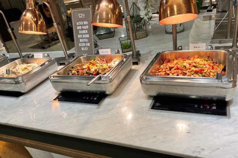 안녕하세요 :) 저는 이제 일주일도 채 식이 안남은 예신이에요! 이것저것 준비하다보니 계약후기를 이제서야 올리게 되었네요 ㅠㅠ.. 게다가 준비할게 많다보니 시식을 늦게가서 사진을 늦게 준비하다보니 계약후기가 늦어졌어요!! 저는 10월 중순 예식이고 제법 날씨가 가을쯤으로 잡힌 예식이여서 제가 좋아하는 분위기인 조금 어둡고 분위기 잡힌 식장에서 하길바랬어요. 저희 예비부부는 둘다 인천에 거주하고 있으나 연수구,계양구에 살고있어서 식장 위치적으로 중간이 부평이 제일 중간이긴 했는데 부평쪽은 제가 찾는 분위기나 가격대의 식장이 없었고 주변 지인들의 추천 및 웨딩북 추천을 통해 계산CN웨딩홀을 예약하여 방문하게 되었습니다! 계산CN웨딩홀은 계산역 바로 도보 3분거리 위치하고 있어서 차가 없이 대중교통 이용하는 분들께서도 접근하기 좋은 위치에 위치하고 있어서 저희는 처음부터 좋게 생각하고 왔었어요! 주차공간도 총 600대라고 하셨는데 저는 위에까진 안올라가봤지만 이전에도 여러 지인들 결혼식에 방문할때 와봤는데 조금 대기시간이 있을때도 있긴하지만 금방금방 순환이 되는 편이라 불편함은 없었어요! 계산CN웨딩홀은 총 4개 홀이있는데 2개는 밝은홀 2개는 어두운홀이라고 하는데 저는 2개홀만 보았고 잘 몰랐는데 1층에도 홀이있었네요! 애초에 밝은홀을 피해서 봐서 잘몰랐던거같아요. 저는 보는날 아예 사진을찍을새가 없었고 사람이 너무 많아서 시식간날만 사진을 찍었어요 ㅠㅠ 첫번째 사진은 웨딩홀 정문입니다! 정면으로 왼쪽은 주차장 들어가는 입구 오른쪽은 atm기계가 있고 주차장 나오는 입구에요! (아래 한번에 사진을 첨부해서 순서대로 언급할게요!) 제가 갔던날도 예식을 이미 하고있다가 끝난시간에 들어가서 사진을 찍은거라서 하객분들이 조금 있는상태인데 이곳이 5층 미엘르홀이고, 보시는것처럼 두번째 사진은 홀 내부인데 샹들리에가 화려하게 여러개 장식되어있고 테이블마다 조화장식으로 꾸며져있는데 전혀 조화같지 않게 이쁘게 장식되어있어요!! 그리고 전면에 스크린 두개로 식전영상을 식전에 확인할 수 있는 형태입니다! 아무래도 앞에 식때문에 버진로드나 앞쪽을 제대로 못찍엇는데 다른곳보다 버진로드도 긴편이고 앞쪽 단상이 꽤 넓은편이라 좋았어요! 세번째 로비 사진은 다른곳들보다 넓은편이라고 생각했고 사진상에는 중간에 화환이 많아 중간을 막고있는데 저 화환들을 치우면 아래 사진처럼 쇼파가 있고 넓게 하객들 대기실처럼 이용할 수 있답니다! 그리고 각 층마다 계단쪽에 엘레베이터, 화장실이 구비되어있어요! 네번째 사진의 위쪽 2층은 대망의 신부대기실입니다! 그리고 밑에 1층 쇼파석은 하객들이 편히 쉴수 있는 대기석 같은곳이고 옆에 벽처럼 보이지만 저곳은 열리는 문이 있는데 제가 설명받기로 혼주분들께서 잠시 대기하실수 있는 대기실로도 사용할 수 있다고 들었는데, 확실히 ... 맞을지 모르겠습니다 ㅠㅠ 다른층 설명을 잘못들었는지 헷갈리네요 ㅎㅎㅎ 그리고 미엘르홀은 신부대기실 올라가는 계단 제일 위에 바로 맞이하는것처럼 포토테이블이있어요! 이날 사진을 찍으러 갔을때 바로 다음식을 준비하시는분들께 피해가갈까봐 신부대기실 사진은 다른사진으로 대체하겠습니다! (아래 다섯번째 사진은 신부대기실 사진이에요!) 저는 신부대기실 분위기도 굉장히 맘에 들었어요! 약간 분위기 있으면서 고풍스럽고 제가 지인들 결혼식 다니면서 느낀건 신부대기실이 넓고 또 다른 지인들이 앉아서 대기할 수 있는 공간이 많다? 라고 느껴졌어요! 물론 다른 결혼식장도 그런곳이 많을수도있는데 제가 다녔던 결혼식장중에는 단연 좋았던거같아요! 제가 보는 정면방향은 들어오자마자 볼수있는 방향이고 옆쪽으로는 하객들도 볼수있는 큰 거울이있었습니다! 다음으로는 연회장 사진들을 준비했는데요, 연회장은 지하1층에 준비되어있고 미엘르홀이 5층이다보니 아무래도 하객분들께서 엘레베이터가 만석일때 조금 불편하실수도 있지만 저는 하객으로 4번정도 다녀봤을때 계단으로 이용해도 딱히... 무리감이 없었습니다! 물론 제 개인적인 의견입니다! (6-8번 사진은 전부 연회장 사진입니다. 연회장은 지하 1층이에요!) 일단 제가 제일 놀랬던건 여러가지의 음식종류였는데요, 계약당시에도 인천에서 음식종류가 제일 많은 결혼식장이라고는 안내 받았었지만 그 말씀에 정말 동의할 정도로 많았습니다! 특히나 신기했던건 저는 고기류보다 해산물류를 정말 좋아하는데 신선한 해산물이 정말많고 제일 신기했던건 냉동을 사용하지 않은 해산물들이 많았어요. 제철 해산물들을 직접 가져다 놓고 직접 손질하셔서 바로바로 내어주시는 것 같더라구요 덕분에 해산물 킬러인 저는 아주 든든하게 먹었습니다! 또 고기류 종류도 여러가지 많았는데 스테이크도 굉장히 부드럽고 조리하는 부분에서 거의 대부분에 연회장이 오픈주방이긴 하지만 저는 제가 계약한 데라서 인건지 ㅎㅎ 보여지는 오픈주방이 되게 잘보여지는 느낌이였어요. 또 아무래도 부모님 손님이 많이오는 행사다 보니 음식적으로 신경이 많이 갔는