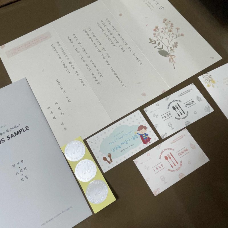 전체적으로 궁금했던 것과 내가 놓칠 수 있을법한 것들은 모두 같이 보내주셔서 빠지지 랂고 편하게 볼 수 있어 매우만족합니다 여기에서 주문해야겟어요! 디자인 : 추천♥ 샘플은 무료로 6장까지 가능하다고해요 원하는 샘플이외에 추천 카드도 옵니다 이달의 혜택이나 사진인화 10장 무료쿠폰 등 혜택도 많아여 가격 : 추천♥ 제가 고른 샘플들에 대한 가격 비교가 편하게 볼 수있개 종이 한장에 정리가 되서 와요! 가격도 싼편!! 서비스 : 추천♥ 용지가 제일 고민이였는데 용지별로 작은 샘플들에 같이오는거 최고!