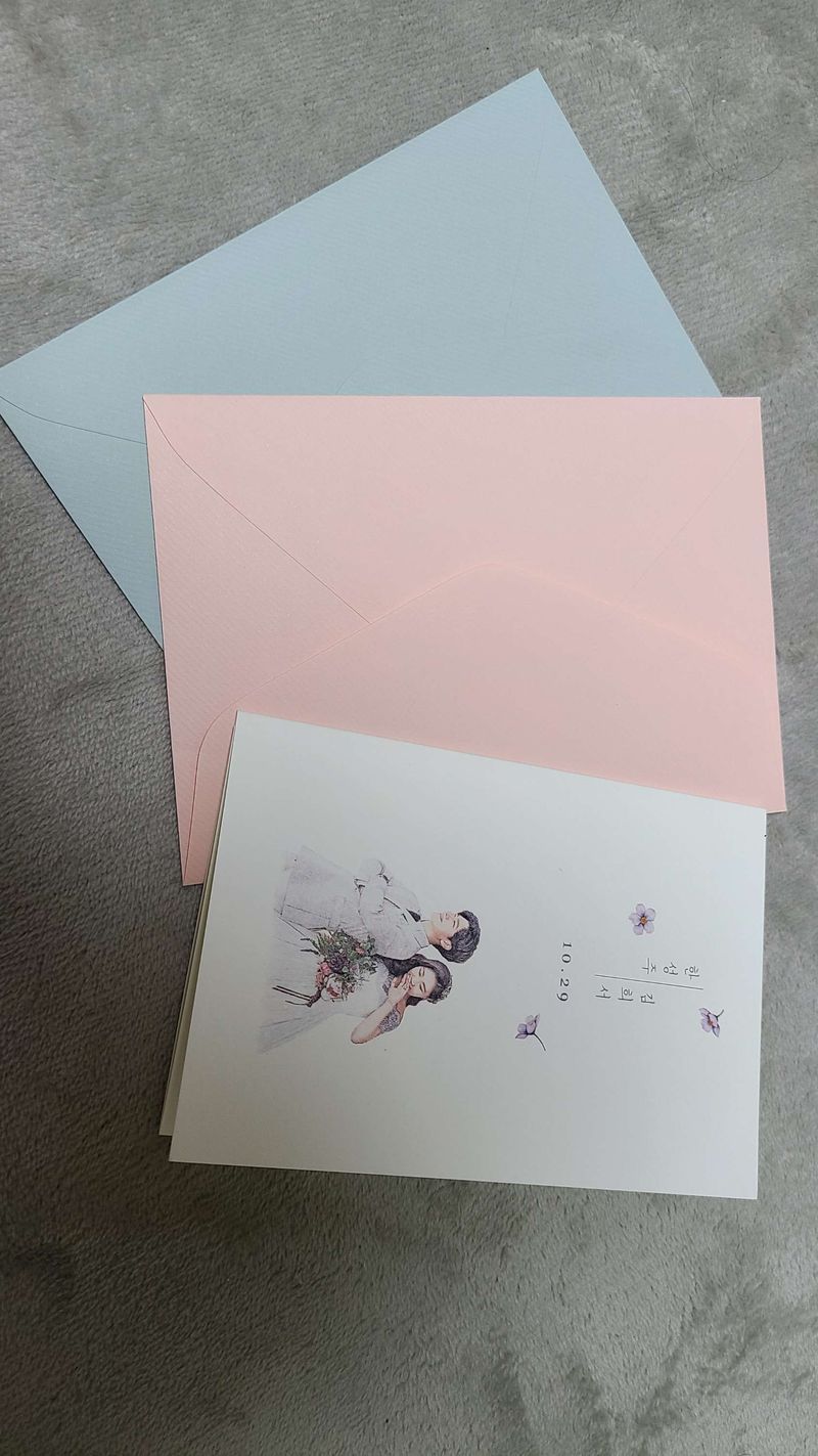 [봄카드 청첩장 최고 ^-^b] 저희가 직접 그린 사진과 아래 고른 청첩장이 제일 잘 어울려서 이걸로 주문 예정이에요-! 같이 보내주신 봉투도 다양해서 어떤 청첩장이 어떤 색의 봉투와 어울릴지 직접 보고 고민해볼 수 있어서 좋았어요 :-) 일러스트계 최고의 청첩장이라고 해도 과언이 아닐듯 해여,, 맘에 드는 일러스트 청첩장 포토 청첩장 많아서 고르기 어려웠는데ㅠㅠ 고민고민 끝에 꽃처럼 예쁜 그대 청첩장으로 선택합니다 💓 #봄카드 #봄카드청첩장 #청첩장 디자인 : 추천♥ 직접 그린 저희 그림이 있어서 그림을 너무 넣고 싶었는데 어울리는 디자인의 청첩장을 발견하지 못하다가 드디어 발견했습니다..! 일러스트 위주로 봄카드가 제일 많고 디자인도 군더더기 없이 깔끔해서 저랑 예랑이 둘다 너무 맘에 들었어요! 가격 : 추천♥ 주문 예정이지만 샘플로 보내주신 청첩장 자체가 종이 두께가 얇지도 않고 고급진 질감이라 정말 맘에 들었습니다 :-) 봉투 색상도 어쩜 이렇게 모두 잘어울리는지 💓 서비스 : 추천♥ 제가 궁금했던 부분을 문의게시판에 올리고 아침에 진짜 빠르게 답변이 왔구요. 그 답변에 대한 또 궁금한 점으로 여쭤봤는데 정말 답변이 빨라서 1대1 채팅 하는 줄 알았습니다 ㅎㅎ 그리고 무엇보다 배송이 빨라서 좋았어요!