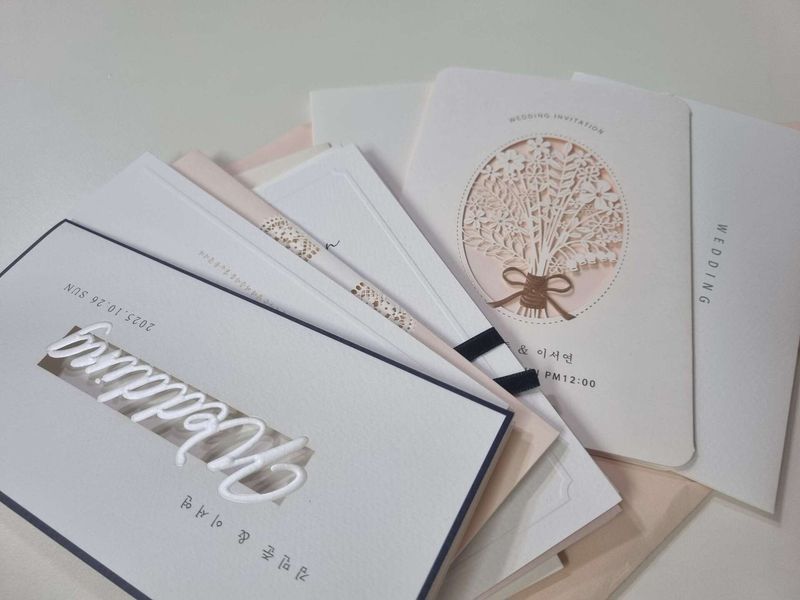 디자인 너무 고급지고 독특한 아이들이 많았어요, 모든 업체 통틀어서 원픽 디자인이 이 곳에 있었어요. 하지만 주문매수가 생각보다 늘어나면서, 욕심을 내려놓고 어차피 버려질 청첩장 돈많이 쓰지말자하며 15만원 아래로 할 수 있는 디자인들 중에 고르다보니 다른 업체껄 선택하게 되었어요. 원픽 청첩장 샘플 개인소장하고 싶을만큼 아쉬운 곳이에요ㅜㅜ 그렇다고 퀄리티 대비 가격이 높은 것도 아니었어요. 추천해요 여러뷴 디자인 : 추천♥ 솔직히 디자인은 여러업체 중에 제일 예뻤다. 어차피 버려질 청첩장이라 가성비 따져 다른 업체를 선택하긴했지만.. 가격 : 추천♥ 이삼십만원대, 혹은 그 이상의 청첩장 업체들과 견줄만한 퀄리티와 디자인 서비스 : 추천♥ 유일하게 샘플주문시 보너스로 몇개 더 넣어줬던 업체
