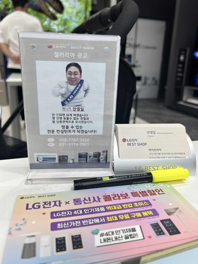 저희는 총 3군데 (트레이더스 lg전자 , 롯데백화점 lg전자 , 갤러리아 광교점 lg전자 ) 를 다녀봤는데 상담을 제일 친절하고 신속정확명확하게 해주셔서 상담을 받는내내 신뢰가 갔습니다~~^^ 추천합니다 상품 : 추천♥ 워시타워, 청소기 a9 , 오브제냉장고, 공기청정기, 티비 가격 : 추천♥ 다른 하이마트나 베스트 샵보다 매장도 크고 신제품도 많고 가격이나 행사도 많이 하고있어서 비싸다는 생각보다는 이정도면 좋지라는 생각이 큼니다 서비스 : 추천♥ 안영일 매니저님 너무 친절하시고 꼼꼼히 상담을 잘해주시네욜
