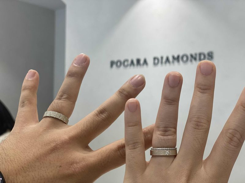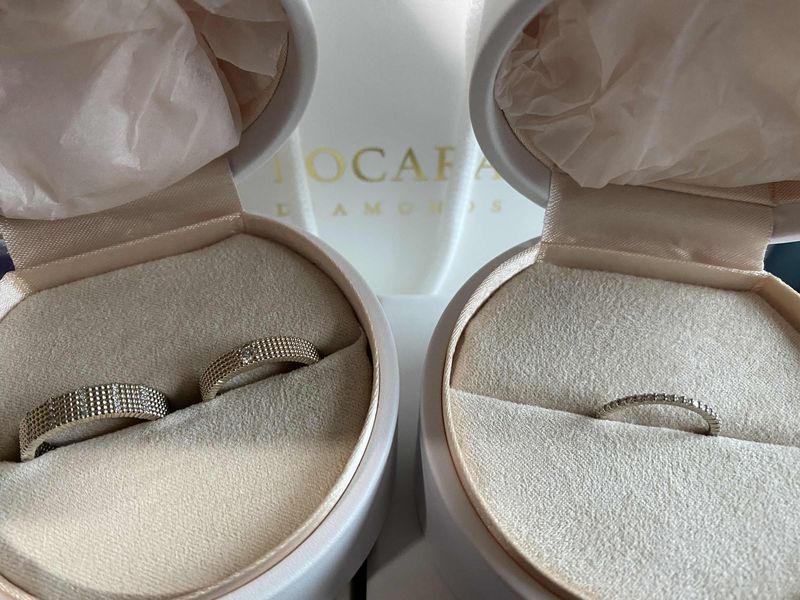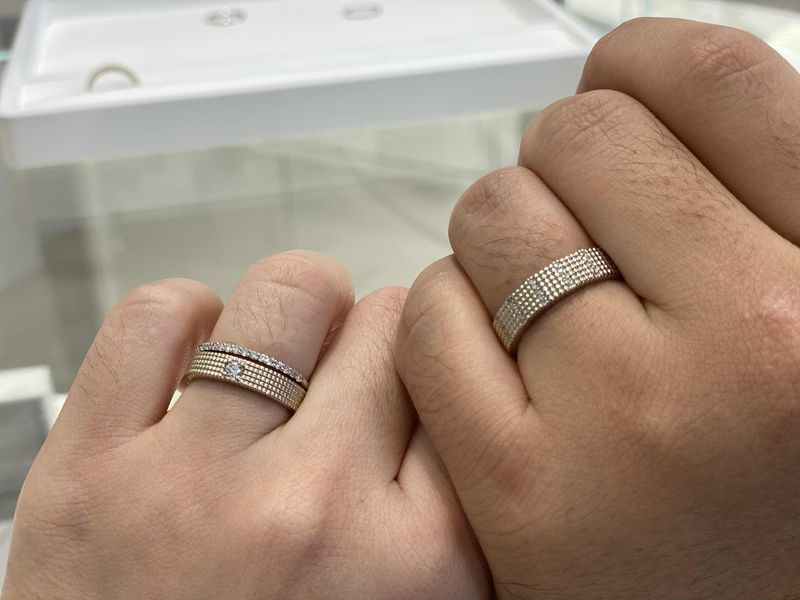 2년전부터 찜해뒀던 디자인인데, 저의 웨딩밴드가 되어서 신나요! 아껴뒀다가 본식 이후 열심히 낄거에요 ㅎㅎㅎㅎ 디자인 : 추천♥ 일반적인 웨딩밴등 디자인과 달리 올록볼록하게 세공이 되어 있어서 독특하고 캐쥬얼한 느낌이 있어서 평소에 끼기도 부담이 없을거 같아요. 보통 여자분들은 3줄로 많이 하시는것 같은데 전 4줄이 무게감이 있어서 안정감이 있는거 같아 골랐습니다! 예랑이의 코스모 노트도 다이아가 자잘하게 6줄이 있어서 고급스럽지만 부담되지않는 디자인이에요 품질 : 추천♥ 손 수 세공해서 모양이 일정하지 않을 수도 있다고 하셨는데 전혀 모르겠어요. 반짝 반짝 예뻐요! 서비스 : 추천♥ 다양하게 껴보면서 오랜 시간 고민했는데 재촉하지 않으시고 맘에 드는 결정을 하도록 기다려주셨고, 웨딩촬영 일정이 한달 반 정도 남은 시점이라 걱정했는데 촬영 1주전에 받아볼 수 있도록 조정해주셔서 촬영도 예쁘게 진행했습니다 ㅎㅎ