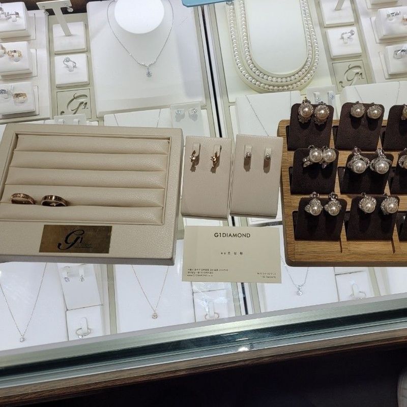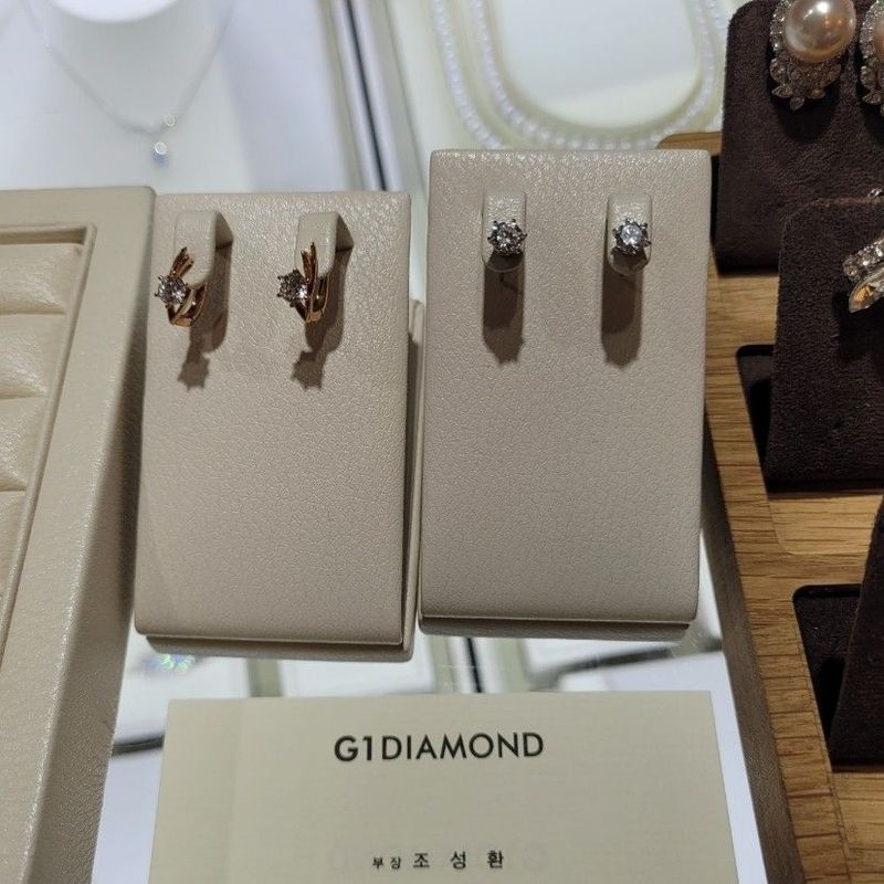 네이버로 예약을 잡고 갔는데 앞에 상담중이신 커플이 반지 출고날짜가 안맞아 그냥 가시는 걸 봤어요. 웨딩 촬영날까지 넉넉하게 한 두달 여유를 갖고 방문하시길 추천드려요. 반지 종류는 다양했고 제가 원하는 스타일은 플래티늄 둥근 심플링이었으나 껴보니 제 피부엔 로즈골드가 어울리더라구요. 제가 원하는 디자인에서 조금씩 변형을 줘서 다양하게 추천을 해주시는 덕에 마음에 쏙 드는 반지로 맞출 수 있었어요. 할인도 많이 해주시고 서비스로 귀걸이까지 주셔서 감사했습니다. 디자인 : 추천♥ 제 것은 로즈골드에 작은 다이아가 자글자글한 디자인으로 골랐고 신랑 것은 골드브라운에 심플한 두 줄 있는 디자인입니다. 결혼 반지답게 끼기 편하면서도 화려한 느낌이 있는 디자인이라 마음이 들었어요. 품질 : 추천♥ g1다이아몬드 반지가 확실히 퀄리티가 좋다고 느꼈습니다. 가게에서 직접 디자인한다고 하여 더 믿음이 갔고 유니크했어요. 서비스 : 추천♥ 예물 계약하고 나서 양가 어머님 혼주 귀걸이와 제 것 귀걸이 하나를 서비스로 주셨어요. 상담내내 전문적이고 친절한 응대로 기분이 좋았습니다.