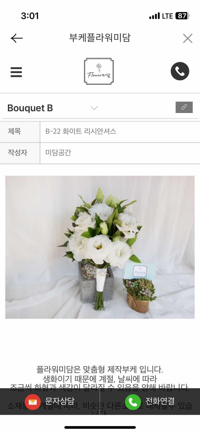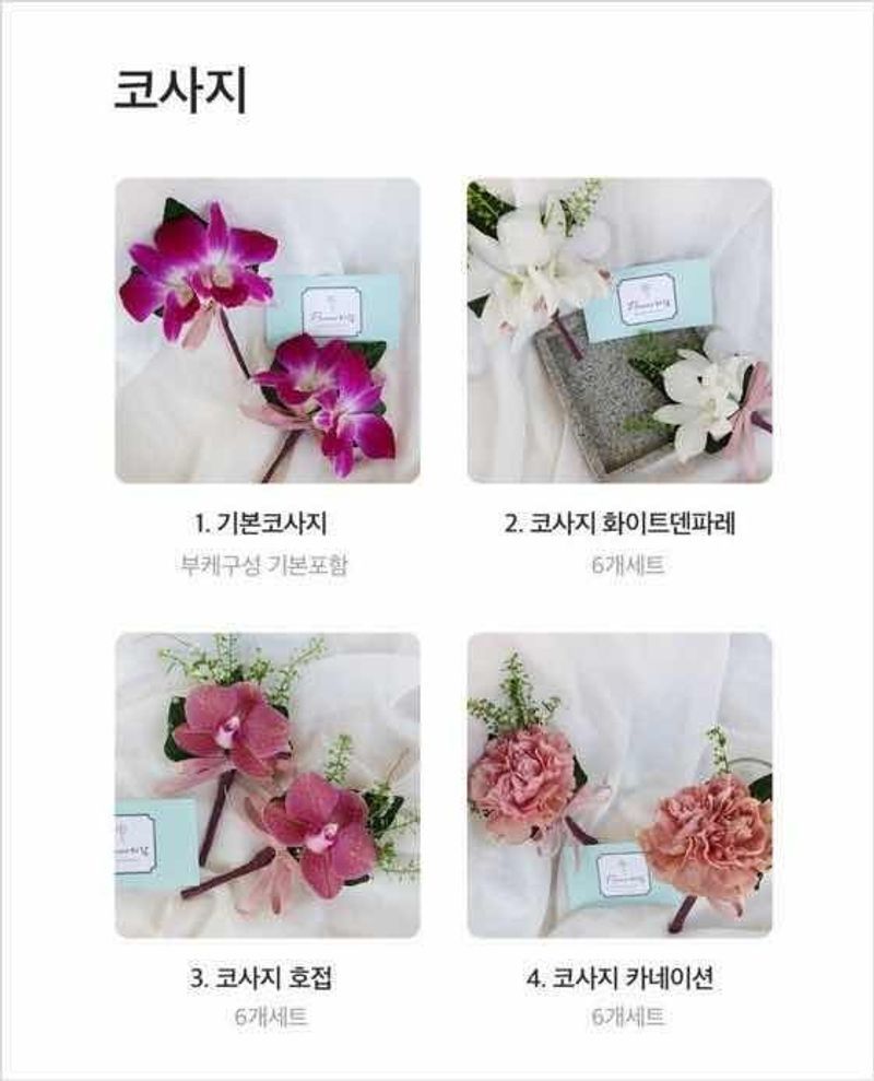 부케랑 코사지 모두 비슷한 느낌으로 골랐어요~ 여름예식이고 웨딩홀이 가든 느낌의 밝은 홀이라 산뜻하게 했습니다☺️ 부케 : 추천♥ 화이트그린컨셉으로 화이트리시안셔스 골랐어요. 코사지도 어울리도록 화이트덴 파레로 골랐어요~ 가격 : 추천♥ 웨딩북 쿠폰 덕분에 저렴하게 잘 구매했어요. 부케 걱정했 는데 생각보다 후기들도 좋고 종류도 많아서 오히려 어떤 걸 고를지 고민이 들었습니다 서비스 : 추천♥ 주문넣고 확인 문자 넣었는데 바로 회신주세요