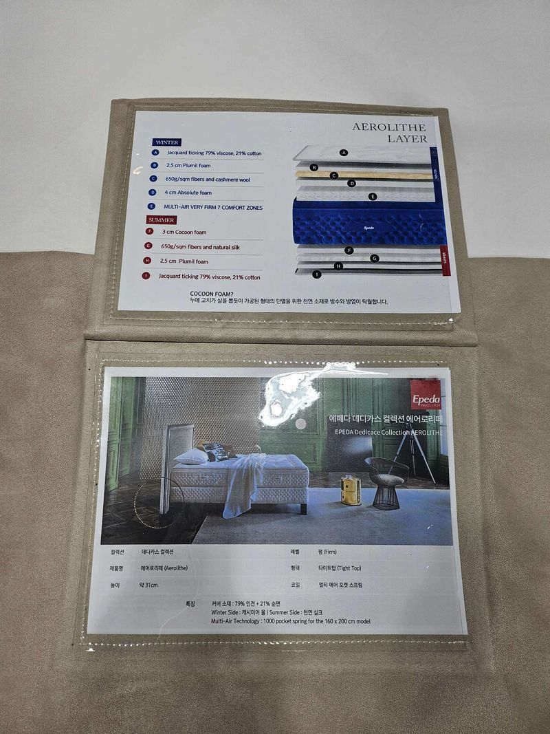 에페다 침대는 유럽 고급체인 소피텔에 들어가고 모로코 왕실에서 사용하는 침대이기도 합니다. 묵직한 미국침대와는 달리 침대기본을 지키면서 누울때 통기성이 느껴지며 부드럽고 탄탄했어요 :) 그리고 양쪽이 여름용과 겨울용으로 되어있어서 매우 실용적이예요 ~ 시몬x 침대 고급라인을 기존에 썼었고 금번이 씰x를 쓰려고 했는데 누워보고 한번에 반했어요 ^0^ 등이 뭔가 시원해요 ㅎㅎ 모든 자재와 공정의 80% 이상 🇫🇷 프랑스 제작의 진짜 침대문화의 나라의 침대로 고민없이 롱런할려구요 ㅎㅎ 참고로 1800x2000 킹 사이즈 샀는데 크라운x구스 라지킹 구스솜과 랄프로렌 킹사이즈 베딩들과 넘 찰떡이예요. 베딩에 투자하시는 신혼분들은 에페다도 꼭 가보시길 추천드려요 . 음반페와 소피마르소도 사용한다고 해요 ~ 이 침대를 만나서 행운이예요!♡♡ #침대 #수입침대 #신혼침대 #매트리스 #에페다 상품 : 추천♥ 에페다 침대 에어로리떼 구매 했습니다 :) 좀더 폭신한 사요랑 고민하다가 좀더 탄탄하고 상위 데디카스 라인 에어로리떼로 구매했어요. 일부로 도착하고 남기는데 지금 넘 만족해요 뭔가 통기성이 좋아요 :) 가격 : 추천♥ 할인이 매장에 기본으로 들어가 있다고 했고 그안에서는 거의 고정이라서 파운데이션 포함 400만원정도에 구입했어요 :) 워낙 고급침대라서 만족해요 ~ 방수커버줘서 좋았어요 감사해요 서비스 : 추천♥ 직원분이 과하지 않고 친절하셨어요 :) 나중에도 언제든지 구입한 침대관련 문의있으면 연락달라고 하셨고 믿음직 스러워요! 다만 해외주문한만큼 배송시간은 보름이상 걸려요 ~ 그래도 기다린시간이 아깝지 않죠 ^^