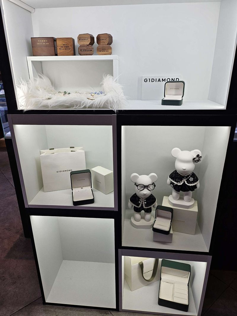 3월 웨딩촬영 전에 결혼반지 맞춰야 해서 종로로 향한 우리 부부! 종로에서 유명하다는 효성주얼리시티! 두 곳을 봤는데 그 중 하나가 G1 이었다!! 예약을 하고 가서 그런지 바로 안내를 받았다 깔끔하고 고급져보이는 매장, 그리고 귀여운 인테리어 당떨어지지말라고 셋팅해놓은 사탕들까지~ 다 좋았다! 여러 개의 반지를 다 착용하다보면 머리 속이 정리가 안될 때가 있는데, 내가 원하는 반지스타일과 구성, 다이아몬드 1부, 3부 등 원하는 것을 처음에 물어보시고 이쪽에서 반지 보세요라고 내가 봐야 할 구역을 알려주신다 반지 껴보겠다고 가르켜서 착용 후 마음에 드는 반지를 여러개 골라서 이상형월드컵같이 비교해서 선택했더니 비교적 고르기 수월했다!! 이사님께서 친절하게 설명해주시고 예상한 가격대보다 많은 할인혜택에 다른 곳 가봤지만 너무 만족해서 계약해서 좋았다. 나는 신랑신부측 어머니 진주귀찌, 브로치, 목걸이는 다 안하고 할인을 받았다! 웨딩반지 졸업해서 행복!!! 디자인 : 추천♥ 여러 스타일의 웨딩밴드가 있었습니다. 심플, 유니크함 품질 : 추천♥ 품질마다 다르겠지만, 보증서를 토대로 국내,해외 기준을 설명 들었고, 품질이 좋습니다 서비스 : 추천♥ 제가 직접 예약한 곳이지만, 바로 예약하고 가서 기다림없어 좋았고, 원하는 스타일, 다이아몬드 크기 등을 얘기해주면 니즈에 맞게 제품을 추천해주시고 착용해보고 비교 하고 결정할 수 있어서 좋았고, 직원분이 친절하시고 설명을 잘해주셔서 이해가 잘 되었습니다 결론적으로 신랑신부 둘 다 만족하는 웨딩반지 맞춰서 빨리 받아보고 싶네요!!