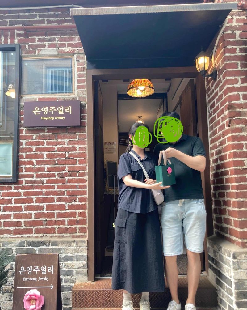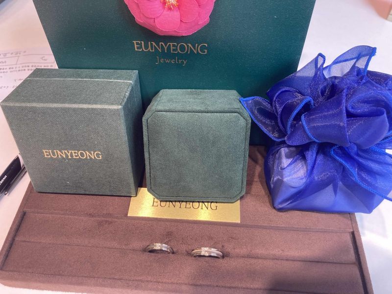 종로에 위치한 은영주얼리 방문하여 웨딩밴드 수령해왔어요. 첫 방문에 계약을 바로 진행해서 기다리다가 제작완료 연락받고 일정 예약후 다녀왔어요! 둘다 피부가 밝은 편이고, 무던한 노을빛골드 컬러의 빛의잔상 웨딩밴드 수령해왔어요!! 그리고 배웅해주시면서 기념사진도 찍어주시는 전통(?)까지 치르구, 잘 돌아왔습니다 :) 디자인 : 추천♥ 디자인이 다양하고 유광-무광 선택과 컬러 커스텀이 가능해서 선택범위가 넓어요! 신랑 신부 같은디자인으로 맞출 수도 있고, 일부 시그니처 디자인은 느낌만 맞춰서 다른 디자인으로 할 수도 있는 모델도 있어서 품질 : 추천♥ 금함유량-다이아에 대한 사항 사전설명도 해주시고, 품질보증서도 당연히 제공받으며 이후 as부분도 설명해주세요! 서비스 : 추천♥ 예약 전화부터 친절하시고, 방문전/계약후/수령후 등등 매번 안내문자도 함께 보내주세요! 제품고를때는 저희가 맘편히 비교할 수 있도록 지켜봐주시고, 막힘이 있을때는 제3자의 눈에서 봐주시고 추천해주셔서 좋았습니다-!