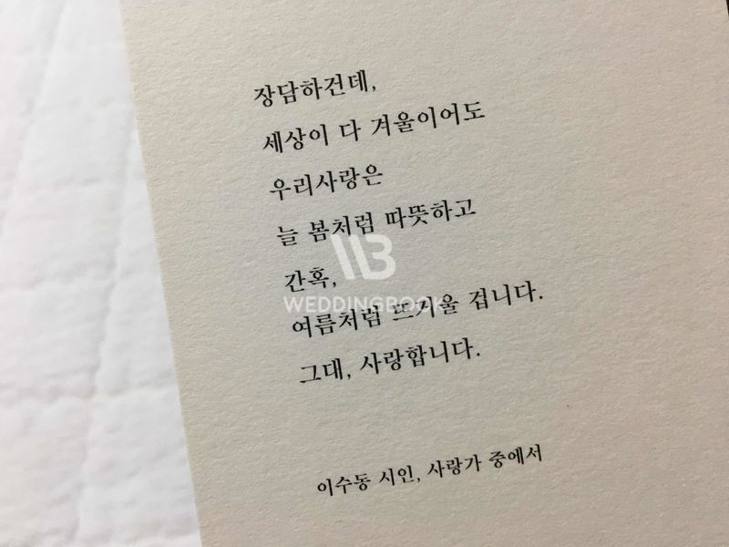 9월 예식을 앞둔 예신입니다. 약 2달밖에 남지않은 요즘 저는 청첩장 준비에 한창인데요, 함께 공유하고싶은 청첩장이 있어서 글을 적게 되었어요 😊 샘플신청한 다음 날, 뾱뾱이 봉투에 소중히 담긴 SINCERELY 씰시리즈 도착. 정중함과 멋짐이 느껴지는 샘플 패키지 👍 (이 패키지는 2만5천원 인데요, 제작하게 되면 적립금으로 전액 돌려주고 해당 적립금은 바로 사용 가능하기 때문에 이 곳에서 제작하실 거라면 무료인거나 마찬가지예요) 상단에는 '결혼해요(그레이)'가 하단부에는 그 외 씰시리즈 카드(총 9장), 봉투(6장), 식사권(2타입), 프리저브드플라워(3개), 그리고 내 이름과 패키지 구성품을 확인할 수 있는 안내카드가 동봉되어 있었다. (군더더기 없는 안내카드 역시 정중함과 멋짐 뿜뿜) 신시얼리의 시그니처 같은 고급지고 세련된 봉투. 모서리 끝 작은 금테두리 하나가 명품백 같기도, 한복과 함께하는 클러치 같기도 한 인상을 주었다. (동.서양이 공존하는 듯한 느낌) 때문에 호텔예식, 전통예식 등 어떤컨셉의 예식이든 모두 잘 커버할 수 있을것 같았다. 4종류의 카드와 식사권 2타입. 상세 이미지는 신시얼리 홈페이지, 인스타그램에 잘 나와있으므로 패스. http://sincerely-card.com/ sincerely.official 꼭꼭 홈페이지, 인스타에 방문하셔서 상세이미지 확인해보시길 추천드려요. 실제로 크기도 느껴보고 종이 두께감도 느껴보고 재질도 만져보고 색감차이도 확인하고 글씨 사이즈도 체크해보고 구성품들 짝도 이리저리 맞춰보다보니 왜 그렇게 샘플신청이 중요한지 알았다. 모니터만 보고 머리에서 이렇게저렇게 상상해보는것과는 확실히 확연한 차이가 있었고, 쉽고 빠른 판단을 내릴 수 있게된다. (요즘 이것저것 결정할게 많은 나로서는 이 부분이 참 고맙고 감사함) 메인으로 쓰이는 글씨체가 묵직하면서 정중한 느낌을 주고있어서 너무 좋음. 오시는길 지도도 신시얼리 자체맵으로 그려주니까 깔끔담백. 너무너무 좋음. 반면에 아쉬운점 하나 발견. 서브 텍스트의 글씨체.. 까지는 이해. 각 타이틀과 본문과의 크기도 동일, 두께도 별차이 없어보이는데 행의 간격차까지 똑같아서 구별되지 않는다는 점이 다소 아쉽다. (타이틀 사이즈를 살짝만 키웠으면..) 작고 사소한 이 분을 제외하고는 120퍼센트 만족하기 때문에 (실물로보니 더 뿅감 😍) 이렇게 함께 공유하고 싶었어요~ 아, 신시얼리 청첩장이 다른 일반적인 청첩장과 가장크게 다른점은 아무래도 '형태'인것 같아요. 평소에 자주접했던 청첩장이 접이식이라면, 신시얼리 청첩장은 낱장형태의 양면인쇄된 종이 2장이 기본구성이었어요. 딱 한 카드만 빼구요. 사랑해요 카드. (오트밀, 헤이즐넛 색상) (한글버전, 영문버전) 씰시리즈 중에는 이 아이만 접이식 이었어요. 이 골드스티커 또한 신시얼리만의 시그니처. 고급짐은 물론 격식을 갖춘듯한 느낌 + 사랑스러운 느낌. (이 스티커 하나 있고없음의 차이가 예상외로 커요) 초대해요 카드. 이 카드는 전통혼례 하시는 분들에게 제격일듯. 단, 색상은 아이보리를 추천합니다. (그레이는 텍스트 가독성이 안좋았어요. 골드 텍스트에 사이즈도 작다보니. 젊은 나도 어른어른 ㅠ) 사랑해요, 초대해요 카드 사진찍어두었는데 업로드 개수제한으로 올려드리지 못해 아쉽네요. 되도록 모니터상에서 느낄 수 있는 점은 제외하고 실제 눈으로 확인했을 때 느낀점 위주로 작성해보았어요. 많은 도움이 되셨으면 좋겠습니다 🤗 카드 한장한장 비닐봉투에 담아서 카드명, 색상까지 표기해 주신 세심함에 감동했어요. 역시. 진짜진짜 전문가 👍 신시얼리, 믿고 진행고고 합니다! 디자인 : 추천♥ 모니터상에서 본 것보다 실제로 크기도 느껴보고, 종이 두께감도 느껴보고, 재질도 만져보고, 색감차이도 확인하고, 글씨 사이즈도 체크해보고, 구성품들 짝도 이리저리 맞춰보다보니 왜 그렇게 샘플신청이 중요한지 알았다. 120퍼센트 만족! 모니터만 보고 머리에서 이렇게저렇게 상상해보는것과는 확실히 확연한 차이가 있었고, 쉽고 빠른 판단을 내릴 수 있게된다. (요즘 이것저것 결정할게 많은 나로서는 이 부분이 참 고맙고 감사함) 가격 : 추천♥ 1. 봉투 : 신시얼리의 시그니처 같은 고급지고 세련된 느낌. 모서리 끝 작은 금테두리 하나가 명품백 같기도, 한복과 함께하는 클러치 같기도 한 인상을 주었다. (동.서양이 공존하는 듯한 느낌) 때문에 호텔예식, 전통예식 등 어떤컨셉의 예식이든 모두 잘 커버할 수 있을것 같았다. 2. 카드 : 신시얼리 청첩장이 다른 일반적인 청첩장과 가장크게 다른점은 아무래도 '형태'인것 같아요. 평소에 자주접했던 청첩장이 접이식이라면, 신시얼리 청첩장은 낱장형태의 양면인쇄된 종이 2장이 기본구성이었어요. / 메인으로 쓰이는 글씨체가 묵직하면서 정중한 느낌을 주고있어서 너무 좋았고 / 오시는길 지도도 신시얼리 자체맵으로 그려주니까 깔끔담백. 너무너무 좋음. 서비스 : 추천♥ 샘플신청한 다음 날, 바로, 뾱뾱이 봉투에 소중히 담긴 SINCERELY 씰시리즈 도착. 정중함과 멋짐이 느껴지는 샘플 패키지 👍 (이 패키지는 2만5천원 인데요, 제작하게 되면 적립금으로 전액 돌려주고 해당 적립