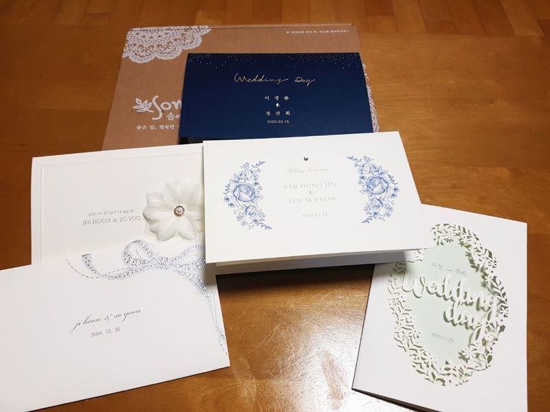 여러군데에서 청첩장 샘플을 받았는데요~전 그중에 솜씨카드께 제일 맘에 들었어요~고급스럽고 포인트로들어간 블루 보석이 흔하지 않고 뭔가 특별함을 느끼게 해줬습니다^^ 디자인 : 추천♥ 청접장 종이 자체도 두껍고 ,디테일도 고급스러워서 좋았어요 가격 : 추천♥ 300매에 245000원 이었습니다~일반카드보다 가격대가 좀 있는편이지만 다른 청첩장들 샘플 많이 받아서 비교해봤는데 가격대비 퀄리티가 높아요~ 서비스 : 추천♥ 청첩장 샘플 주문한 다음날 도착했구요~예쁘고 깔끔하게 포장이 잘되어서 왔어요~
