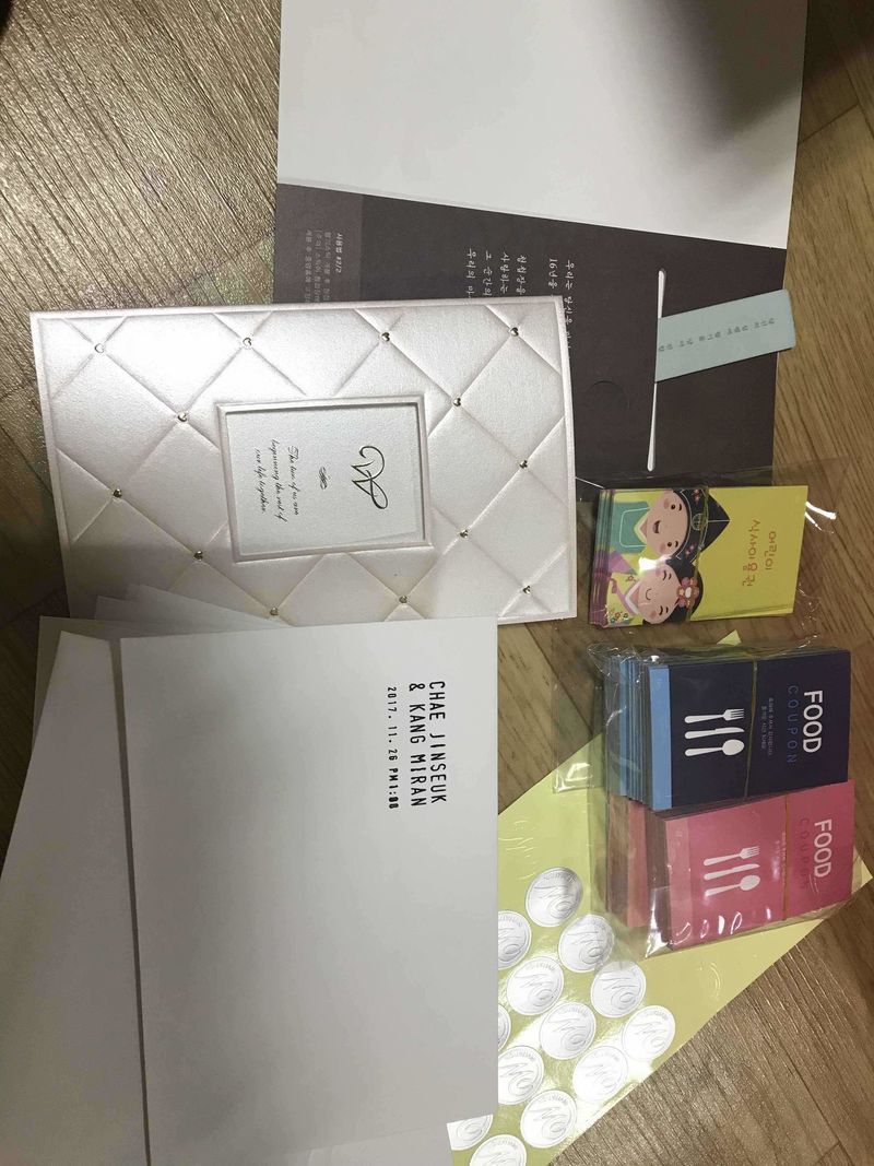 식권도 서비스로 같이 오고 청첩장도 너무 예쁘게 잘 나와서 대 만족 입니다~ 박스 안에 함께 들어온 향기 스틱도 있어서 굳이 비용 추가해서 향기나는 봉투를 선택하지 않아도 은은하게 청첩장에 향이 퍼져서 너무 좋네요~^^ 디자인 : 추천♥ 처음에 고를때는 그냥 아무생각없이 중간정도의 가격으로 깔끔한 디자인으로 골랐는데 받는 사람마다 청첩장 예쁘다고 하시는 분들이 많아서 점점 뿌듯해 지고 있어요~ 가격 : 추천♥ 200장씩 신랑신부 합치면 총 400장 만들었는데 생각보다 많이 남네요^^;; 둘다 많이 남아서 절반만 했어도 괜찮았을거 같아요ㅋㅋ 품질은 제가 400장 전부다 접었는데 불량도 거의 없고 빠르고 예쁘게 잘 나와서 좋았어요 서비스 : 추천♥ 처음에 청첩장 신청하고 시안 확인 후 수정 할 사항이 있으면 빠르게 확인해주시고 금방 수정되어서 청첩장 만드는데 수월했어요~ 청첩장 만든사람에게는 동영상 제작 서비스도 있는데 웨딩촬영사진하고 연애할때 데이트 사진도 빨리 모아서 동영상 신청 할 예정이에요~ 동영상도 기대됩니다+_+