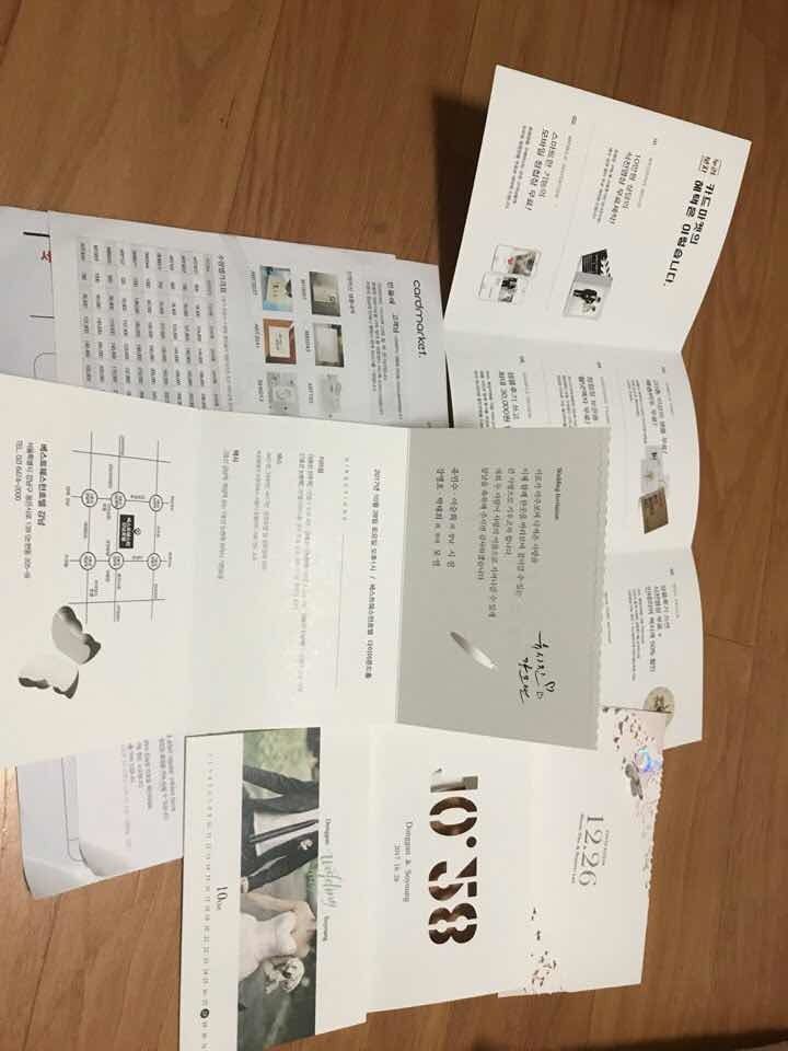 디자인 예쁘고 보는 분들마다 청첩장 정말 예쁘다 해주셔서 만족합니다! 다만 홈페이지에서 주문 시 수정 부분이나 이런 UI가 편하진 않아서 직접 그린 파일 등을 업로드해서 요청드렸는데 이 부분 개선해주시면 더 좋을 것 같아요! 디자인 : 추천♥ 다른 업체 몇군데에서 동시에 샘플을 받아보았는데 제일 예쁜 디자인이 많아서 최종후보군에 카드마켓 디자인이 제일 많았어요 ㅋㅋㅋ 가격 : 보통♥ 가격은 이래저래 필수옵션 같이 포함되어서 막~저렴하게 한 건 아닌 것 겉아요. 품질이 나쁘지 않아 가격대비는 그래도 보통이에요! 서비스 : 추천♥ 추가 수정안이나 요청 사항등을 잘 확인하고 반영해주셨어요! 애매한 부분은 전화로도 물어주시고 한번수정하고 바로 확정했어요!