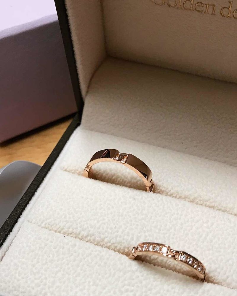 드라마에서도 나왔다고 하더라구요. 연결고리모양이 잘못하면 흔해 보일 수 있지만, 골든듀의 연결고리모양은 묘하게 좀 달라요. 좀더 고급스러운 느낌? 각이 잡힌 느낌? 여튼 반짝반짝 하고 너무 이뻐요! 단점이라면 연결고리가 한바퀴 쭉 균일한 간격으로 있어서 나중에 싸이즈조절이 불기능하데요~ 그래서 일부러 한치수 크게 맞췄어요~ 여튼 골든듀 반지 강추입니다^^ 디자인 : 추천♥ 타임리스링으로 연결매듭모양이에요~ 특히 여자꺼는 반쪽은 민무늬고 반쪽은 작은다이아몬드들이 박혀있어 민밋하지 않아요. 품질 : 추천♥ 품질은 당연히 골든듀는 전부 18케이잖아요. 고급스럽고 너무 좋아요 서비스 : 추천♥ 원하는 가격대로 추천도 잘 해 주셨고 친절했습니다!