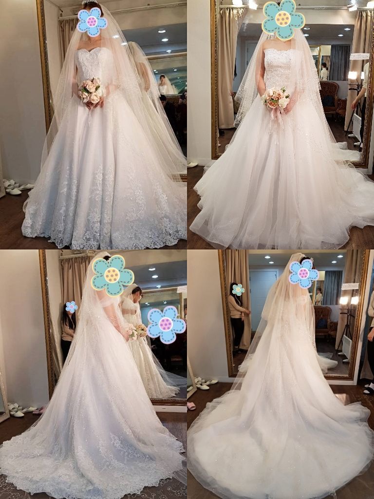 가성비를 생각하신다면 추천드립니다. 스타일 : 보통♥ 풍성, 세미, 머메이드 등 다양한 디자인이 있고요. 저는 드레스투어없이 웨딩화보집 보고 바로 지정해서 리허설, 본식가봉까지 마친상태입니다. 원하는 스타일을 마음속으로 생각하시고 결정해두시는 것이 좋아요! 다만 좀 아쉬운 점은...저는 좀 튀거나 독특한것을 좋아하는데 그런 스타일은 별로 없는 것 같았어요. 무난해요! 그리고 다른 샵은 안가봐서 모르겠지만 드레스를 제가 보고 고르는 것이 아니라 추천해주시는 것을 그냥 입어보는 것이어서 아쉬웠어요 옷상태 : 깨끗한건 깨끗한데.... 촬영리허설날 입엇던 드레스에 까망이가 좀 묻어있더라고요.... 살과 직접 닿는 부분은 아니어서 그냥 아무말 없이 입었지만 관리에 조금 더 신경써 주셨음 좋겠어요. 본식가봉하고 왔는데 베일도 끝부분이 잘려나간듯이.. 그런 부분이 보였고요... 서비스 : 보통♥ 어떤 스타일을 원하는지 꼼꼼히 상담해주시고요, 제 스타일에 맞춰 드레스를 추천해주십니다. 전문가들이니 입맞에 잘 맞춰주셨겠지...하고 입어보지만 진짜 아닌건 보여주셨을 때 아니에요!!!하고 외치세요 ㅎㅎ 강요는 안하시더라고요. 신부의 피부톤이나 체형을 고려해서 드레스 설명도 해주시는 점은 좋았어요.