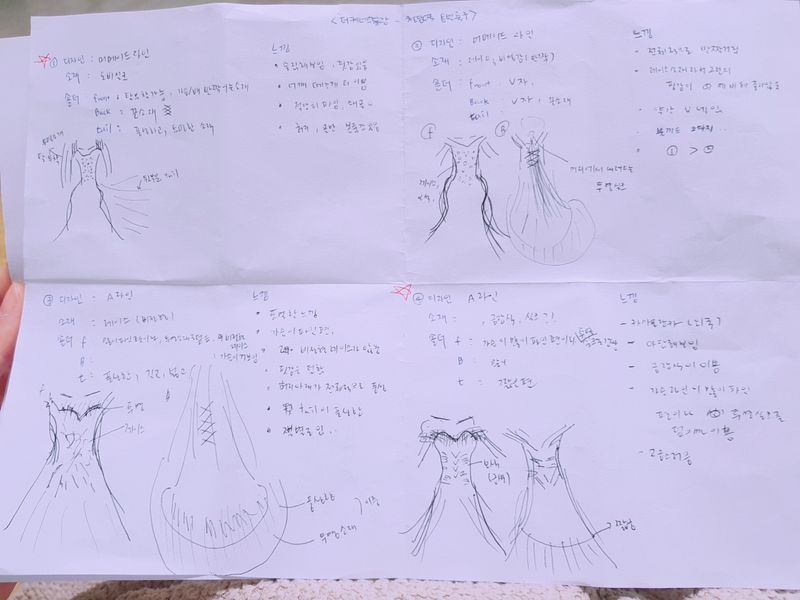 드레스투어는 사진촬영을 못해서 예비신랑에게 그림 그려달라구 했는데 특징이랑 그림을 넘 잘그려줬지만 나중엔 눈으로 저에게 맞는 드레스를 본거보다 드레스 그림그리고 특징을 쓰는거에 바빴던거같아요! 드레스투어는 샵 드레스 느낌을 보는거니까 눈으로 다 담고 옷갈아입을때 느낌 한두줄 정도면 될것같다는 개인적인 생각이..ㅋㅋ 나중에 그림보면 무슨 드레스인지 기억이안나요..ㅋㅋ 스타일 : 추천♥ 머메이드 드레스 진짜 다 이뻤어요!! 고급지면서 우아하단 느낌많이 받았어요! 옷상태 : 추천♥ 깨끗하더라구요! 오래됐다는 느낌은 하나도 못 받았어요^^ 서비스 : 추천♥ 머리 말린상태로 그냥 갔는데 손수 올림머리 해주시고 하고싶은 악세사리도 다 해주셨어요^^ TIP : 샵이 가진 드레스 전체적인 느낌을 봐야하니까 어떤 드레스가 이쁘다 안이쁘다가 아닌 신부에게 어울리는 드레스를 봐야하는데 생각했던거랑 막상 입어본거랑 다르더라구요! 본인이 생각했던 드레스만이 아닌 종류별로 추천해주신걸 입어보는걸 추천드려요!