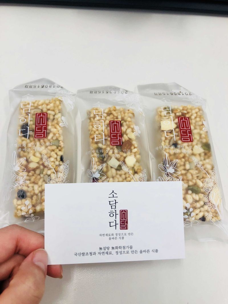 멀리계신 어른들께는 어떤 선물을 할까 하다가 소담하다를 선택 했어요. 인스타에서 예전에 봤었는데 웨딩북과 제휴도 되어있더라구요. 소량이었지만 정성스레 포장 해 주시고 스티커도 제작해서 붙여주시는 정성이 감사했어요. 견과보틀도 생각 했었는데, 견과는 오래 된 것을 쓰면 냄새도 나고 호불호가 있어서 영양바로 결정! 다행히 제품윗면에 유통기한이 쓰여있어서 더욱 믿음이 가네요. 저희 먹으라고 넣어주신 걸 먹어봤는데 너무 달지도 않고 맛있네요. 내용도 알차서 점심 이후 출출한 시간에 배송되면 딱 좋겠어요. 손으로 잘라도 조청(?)이 손에 뭍지않아 좋고 맛있게 먹는 방법이 명함뒷면에 쓰여 있어요~ 고소하니 맛있네요. 답례품이 아니더라도 사 먹고 싶어요 ㅎㅎ 업체 : 추천♥ 가까운 곳엔 떡으로 답례품을 보냈는데, 먼 곳에 계신 분들은 뭘 보낼까 하다가 선택했어요 가격 : 추천♥ 바 3개에 좀 비싼 것 아닌가 싶었는데, 실제로 받아보니 크기가 커서 적당 한 것 같아요 서비스 : 추천♥ 주문하자마자 연락 주셔서 스티커제작 여부와 배송여부를 꼼꼼하게 체크 해 주셨어요.