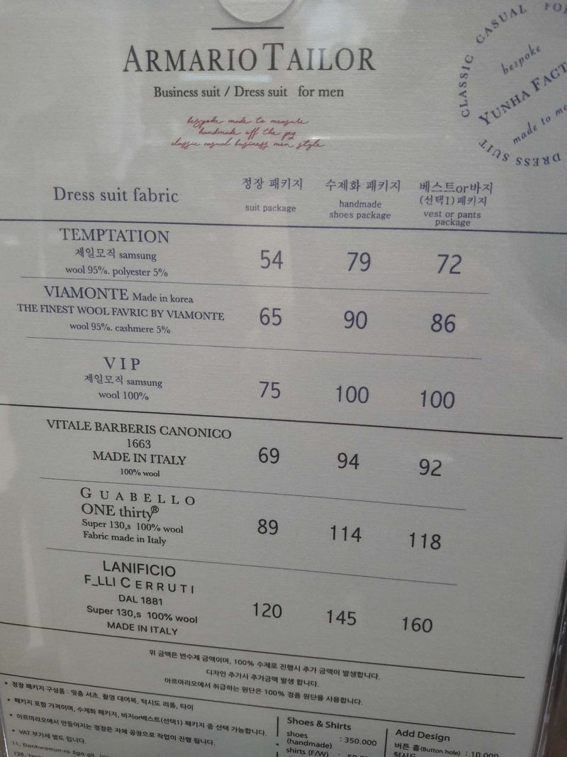 찾아보니 평이 좋았고 가격도 착하다고해서 웬만하면 여기서 해도 괜찮겠다는 생각으로 갔는데 남자 선생님이 셨는데 설명이 별로없다보니 뭔가 선택하기 어렵더라고요ㅜㅜ 결국은 결정은 못하고 다른곳에 알아보러 가야했던점이 무척 아쉬워요ㅜ 지금 다른곳에 둘러보고 계약하고 생각해보면 템테이션으로 할거면 2벌가격으로는 저렴했던것같은데 수입소재는 잘 모르겠어요ㅜㅜ저희도 물어봤어야했는데 우리가 좀 수동적이였구나 싶네요^^;; 꼼꼼히 알아서 알려주길 바랬던거같아요 상품 : 보통♥ 국내 원사로는 템테이션을 해외원사로는 까노니코 등등 여러가지가 있었답니다. 가격 : 보통♥ 가격은 저렴한 편이 였던거 같은데 설명이 별로없으니 좋은지도 잘 모르겠더라고요 서비스 : 서비스가 진짜 아쉬운 집이예요. 예복투어하려고 간 첫번째집이였어요.근데 별다른 설명이 없고 원단 고르라고 하시고 그거 정해지면 체촌한다시고 뭘 모르니 원단마다 특징이 있을텐데...
