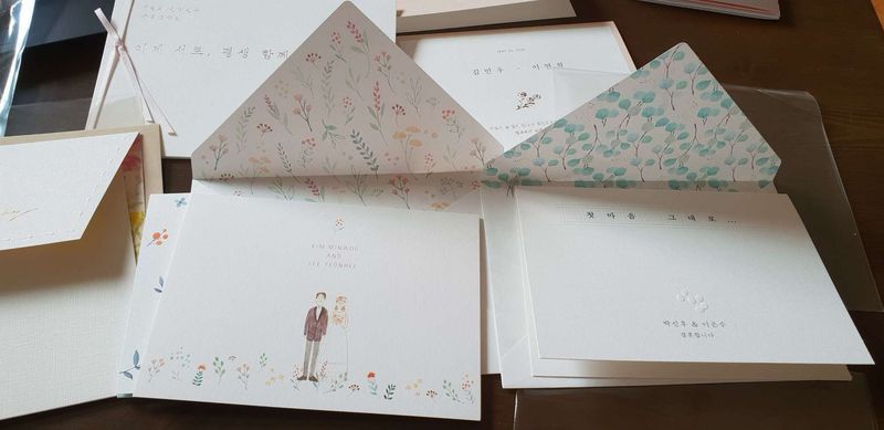 다른 곳과 가장 많이 달랐던 것은 샘플 신청한 청첩장 하나 하나를 세트 봉투랑 함께 하나씩 다 낱개로 포장해주셔서 좋았습니다. 아쉽게 탈락했지만 ㅜㅜ 가장 마음에 드는 청첩장이 많았어요~ 디자인 : 추천♥ 깔끔한 스타일에 청첩장이 많았어요ㅠㅠ 거기에 예쁜 봉투까지같이 세트로 되어있어서 좋았습니다. 가격 : 추천♥ 청첩장과 봉투 모두 질이 정말 좋았어요~ 서비스 : 보통♥ 배송이 다른곳보다 좀 오래걸렸었는데, 바른손카드. 더카드. 비핸즈카드가 같은 회사여서 함께 오느라 늦었더라구요 ㅋㅋㅋ