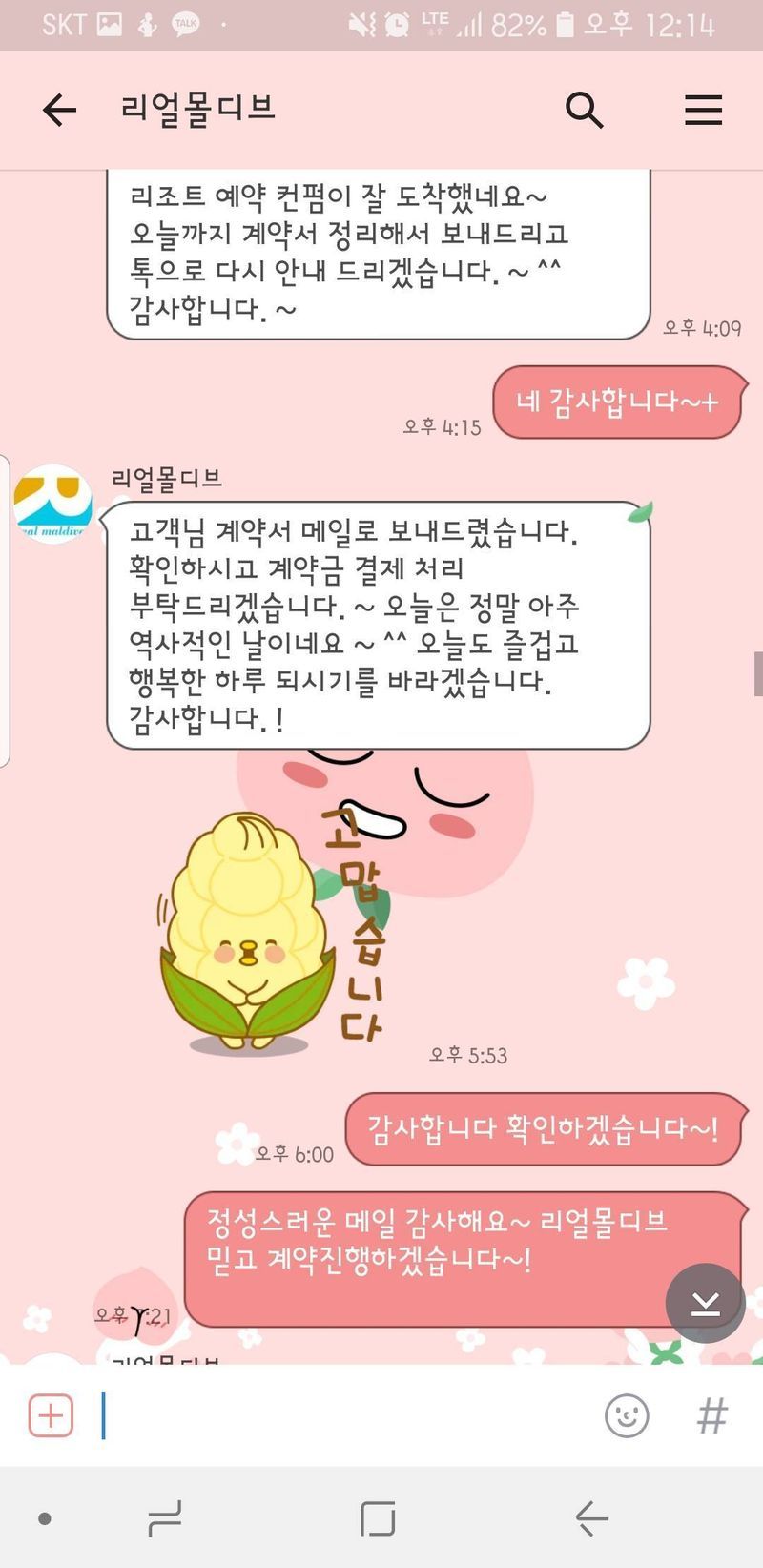 신행 다녀와봐야 더 확실히 알겠지만 고객을 대하는 태도나 서비스, 상품이 다 좋았어요. 다른 여행사에 하려고 했던 제 마음을 확 바꾼 곳이었습니다. ^^ 상품 : 추천♥ 여행지 : 몰디브 리조트 : 상겔리 바이 앳모스피어(=오블루 상겔리 바이 앳모스피어) 객실타입 : 허니문 워터풀스윗 4박 기간: 9/30~10/3 으로 계약했습니다. 가격 : 추천♥ 허니문워터풀스윗 객실은 딱 6채밖에 없는데 운이 좋았어요~ 1박에 120만원 정도 되었고요, 18년 7월 오픈하는 리조트라서 나름 프로모션이 들어간거였어요. 커플 마사지 2회 제공이 큰 장점이었습니다. 서비스 : 추천♥ 플래너님이 추천했던 여행업체에서 제시한 게 마음에 안 들어서 제가 직접 알아본 곳이었어요 ㅋ 두 곳을 비교했는데 꼼꼼한 상담과 좋은 리조트를 추천해 주어서 바로 계약했답니다.