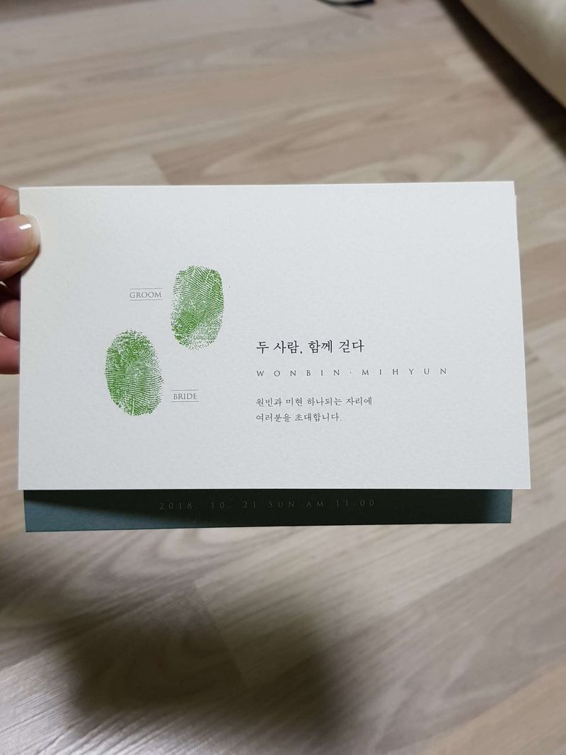 저희는 산뜻한 신혼부부의 느낌을 잘 표현해줄 청첩장을 찾고있었어요! 총 9군데 100장의 청첩장 샘플중 의견 100프로 일치는 봄티비였어요! 앞면 넘기면 파릇한 나무 그림 있는데 부모님들께서 너무 맘에 들어해주셨고 모든면에 저희이름이 있는것도 좋구요ㅎㅎ 예뻐서 더더욱 좋습니다! 디자인 : 추천♥ 전반적으로 깔끔했고 산뜻한 느낌이 나는 청첩장으로 골랐어요~ 가격 : 추천♥ 종이 재질도 좋고 사은품 구성도 너무 맘에듭니다ㅎㅎ 가격도 전 매우 만족했어요! 서비스 : 추천♥ 시안확인 할수있게 문자도 따로넣어주시고 피드백 빠릅니다! 배송도 빠르구요! 지금 인쇄 확인중인데 아직 요청사항 없어요!