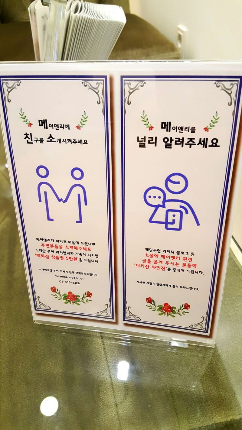 아이니 웨딩홀 박람회 갔다가 메이앤리 상담받고 바로 예물하러 갔어요! 플래너님이 추천으로 일단 상담받고 진행했습니다. 백작부인도 받으려고 했는데 시간이 촉박하고 그냥 뭔가 마음에 들어서 정계약하고 바로 매장에가서 다시 상담 받았습니다. 너무너무 예쁘고 가격도 적당하고 좋았습니다. 즐겁게 예물봤어요! 특히 서비스가 너무 대단해서 기분이 너무 좋았습니다. ※반지사진은 디자인 보완상 생략하겠습니다. 디자인 : 추천♥ 디자인도 많아서 고르기 힘들었는데 실장님이 설명해주셔서 고르기 쉬웠어요! 품질 : 추천♥ 가격도 잘 맞춰주시고 반지 낄때 느낌이 너무 좋아요ㅎ 안쪽부분이 둥글둥글 해서 끼기 편해요☆ 서비스 : 추천♥ 설명을 너무 잘해주셔서 좋았습니다. 그리고 가격도 잘 맞춰주시고! 서비스도 너무 좋았습니다!! TIP : 저는 심플한걸 좋아해서 심플한걸로 했습니다. 어떤거든 상담해주시는 분과 잘 상의하시면 친철하게 해주시고 가격도 웬만하면 다 맞춰주세요!!그러니 부담갖지 말구 상담 받아보세요! 상담 받는데 돈 드는거 아니니까요ㅎ