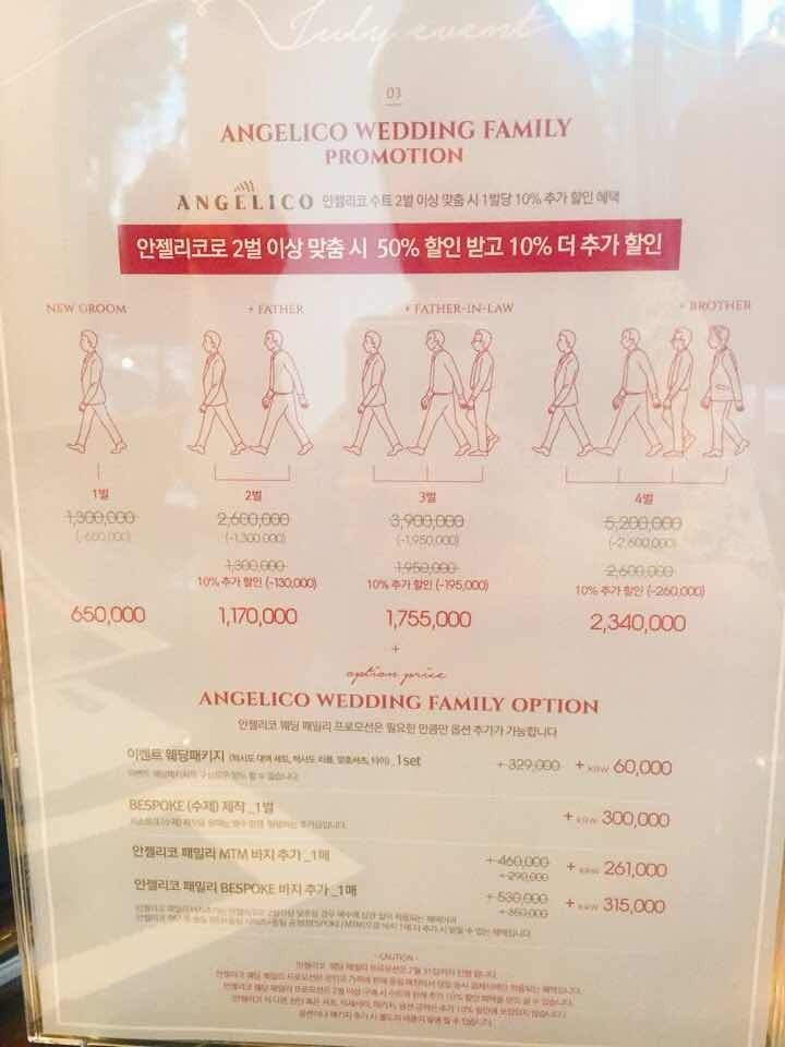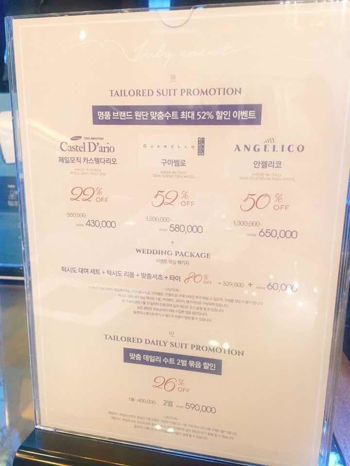 지금 제일모직이 프로모션으로 할인을 많이해서 웨딩패키지로 주문했어요~ 제 예랑이는 정장을 거의 입지 않는 편이라 고급 원단은 처음부터 보지 않았고 국내 원단쪽으로 생각하고 갔어요. 지금 프로모션 할인이 많이 들어가서~ 상담받아보시길 강추 드려요~^^ 상품 : 추천♥ 저는 예랑이 예복 웨딩 패키지 구성으로 상담 받았어요~ 예복을 많이 하는 업체여서 그런지 웨딩 패키지가 잘 되어있더라구요~^^ 가격 : 추천♥ 지금 루쏘쏘가 15주년 기념으로 할인행사를 많이 하고 있어요~ 다양한 수입원단에 따라 할인율이 많았어요~ 다른 예신님들두 예복 고민중이시면 방문해서 상담 받아보심 좋을 것같아요~!! 서비스 : 추천♥ 상담해주시는 분인 한분이셔서 꼭 예약을 하고 방문하셔야해요~ 저흰 웨딩북통해서 예약하고 방문했는데 정말 친절하게 잘 응대해주셨어요~^^