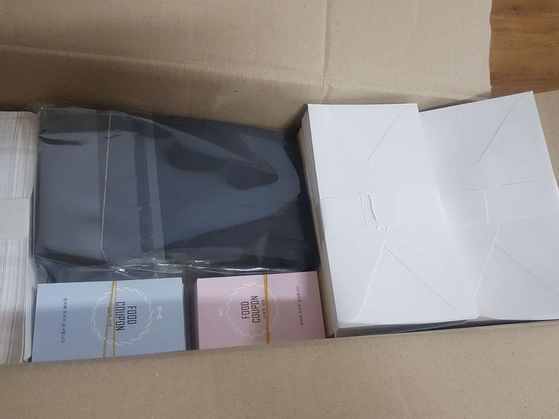 샘플신청이나 결제하고 초안부터 최종확정까지 답답함없이 빨리빨리 진행되서 청첩장을 빨리받을수있었어요ㅎㅎ 디자인때문에 조금 예산을 벗어났지만 그만큼 디잔인 품질 모두 좋았어요ㅎㅎ 디자인 : 추천♥ 청첩장은 심플하면서 예식날짜와 장소 시간등이 바로 보일수있는 디자인으로 보던중 제가 딱원하던 디자인이 있었어요ㅎㅎ 많은 샘플들이있었지만 이거보고나서는 다른 샘플들은 안보였네요ㅎㅎ 가격 : 추천♥ 주문은 예랑이 저 합쳐서 400장을 주문했고 여유분도 넣어주시더라구요ㅎㅎ청첩장은 싼걸로 하자 했는데 그래도 마음에드는걸 하다보니 20만원이 넘었지만 가격대비 종이도 충분히 두꺼웠고 고급진 느낌이였어요 서비스 : 보통♥ 초안부터 최종 결정까지 직접적인 연락은 없었지만 초안이 나오고 최종결정까지 바로바로 알림톡을 보내주시는덕분에 빨리빨리 결정된거같아요ㅎㅎ 서비스로주는 식권도 너무 귀여웠고 여유분도 넣어주시는센스ㅎㅎ 근데 저희청첩장이 띠지가있어서 띠지를 연결하는 투명스티커를 6개정도 비게보내주셔서 나중에 몇개는 못붙일거같아요ㅜ 이점이 좀많이 아쉬운거같아요ㅜ