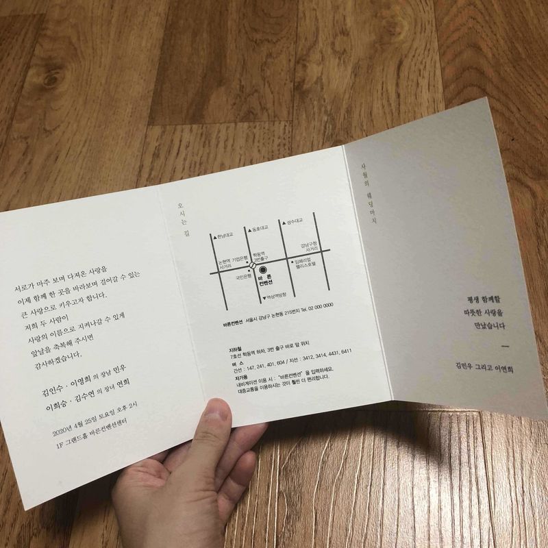 저는 바른손카드에서 샘플을 신청했는데 주문하려고 보니 비핸즈 카드였더라구요 ㅋㅋㅋ 같은 업체라 그런지 함께 보내주신거 같아요! ㅋㅋㅋ 사실 이게 좀 의문이긴한데 맘에 들어서 결정했어요! 3단 형식이구 달력이 들어가 있는게 너무 맘에 들었어요!! 오늘 주문했는데 빨리 받아보고 싶습니다~~ 디자인 : 추천♥ 오래된 업체답게 종류도 다양하고 샘플을 받아볼 수 있어서 좋았어요! 가격 : 추천♥ 저희는 200매만 주문했는데 나름 합리적인 가격으로 잘 한것 같아용~ 서비스 : 추천♥ 다양한 샘플과 빠른배송!! 완전 만족합니다 ㅋㅋ 많아서 고르기 어려웠어요