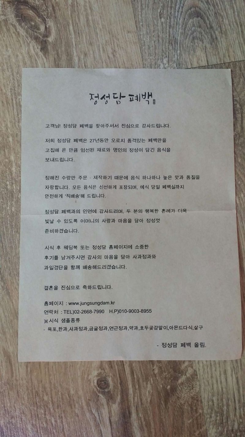 폐백을 하게 되서 주문하려고 했는데 부모님들이 시식이 있으면 좋겠다고 해서 웨딩북이 생각 나더라구요~~^^ 미리 모아둔 포인트로 결제해서 시식 받았어요.. 육포랑 약과, 한과 맛에 비중을 두고 비교했는데 정성담이 식구들이 먹어보고 제일 괜찮다고 하네요~~^^ 구성 : 추천♥ 어플 폐백 시식 샘플 이용했어요~~^^ 가격 : 추천♥ 패백 시식 샘플 택배로 포인트결제 주문했어요. 서비스 : 추천♥ 택배 발송후 친절하게 메시지로 알려주셨네요~~ 시식 포장안에도 편지가 있었구요~~
