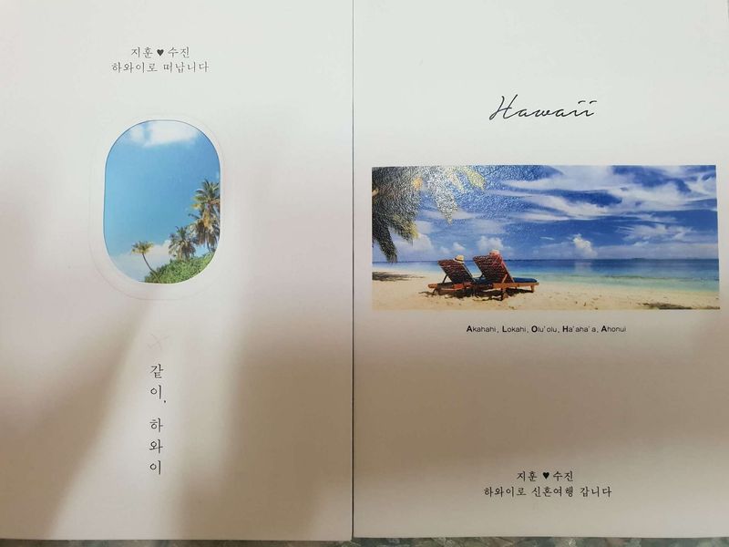 샘플 목록과 가격표를 잘 정리해서 보내주셔서 좋았어요. 식권도 두 종류를 보내줘서 취향에 맞게 고를 수 있게 예쁘게 디자인 되어 있어요. 신혼여행지를 알릴 수 있는 청첩장이 있는게 특색인 곳입니다. 디자인 : 추천♥ 신혼여행 가는 곳을 알릴 수 잇는 청첩장이 눈에 띄어서 샘플을 신청했어요. 가격 : 추천♥ 가격대는 300장 기준으로 10만원정도인 청첩장이 귀여운 디자인이라 마음에 들었어요. 가격대는 디자인과 종이 품질에 따라 다양해요. 서비스 : 추천♥ 수요일 밤에 샘플 신청했고 그 주 금요일에 받았어요. 비닐 안에 예쁜 상자에 담아서 보내주셨네요. 상자는 5군데 샘플 받았는데 제일 예뻤어요.