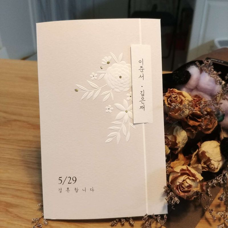 청첩장 2군데서 받아봤는데 큰 회사이고 오랫동안 해와서그런지 믿음이가고 고를수있는 청첩장의 종류도 다양해서 참 좋았어요! 그리고 다른곳보다 가격적인 면에서도 만족했답니다. 특히 식전영상을 무료로 제공해준다는데 어떻게나올지 기대중^^ 사람들이 많이 하는데는 이유가있는것같아요 꼭 샘플받아보시고 하세요! 화면보다 예쁜 카드들이 많습니다! 디자인 : 추천♥ 바른손카드는 전형적인 청첩장양식을 고수하는거같아요! 물론 디자인은 요즘트렌드에 맞게 너무도 예쁘게 나왔구요. 어떤곳은 양식이 세로로 길고 속지낱장이 포함되는 등 새로운 양식을 사용하는데 그거때문에 선택을 못하겠더라구요 부모님들이 싫어하세요.. 그런데 바른손은 깔끔하게 정보전달에 충실한 양식이 마음에들어서 바로 선택했습니당! 가격 : 추천♥ 1000매하면 매수가 많아 50%받은 상태에서 추가10% 할인해주구 샘플받아본 후기를쓰니 최하1만원 최대5만원할인권을 또 추가로 할인권을 주더라구요! 저는 후기는 안써서 36만원에 구매했고 다른곳 샘플보다 두께감있고 볼록 튀어나온부분이있어 고급스럽게 잘 나왔습니다^^ 서비스 : 추천♥ 피드백이 빠르고 좋았어요! 청첩장 추석전에 하려고 불안해하고있었는데 생각보다 빨리 나오더라구요^^