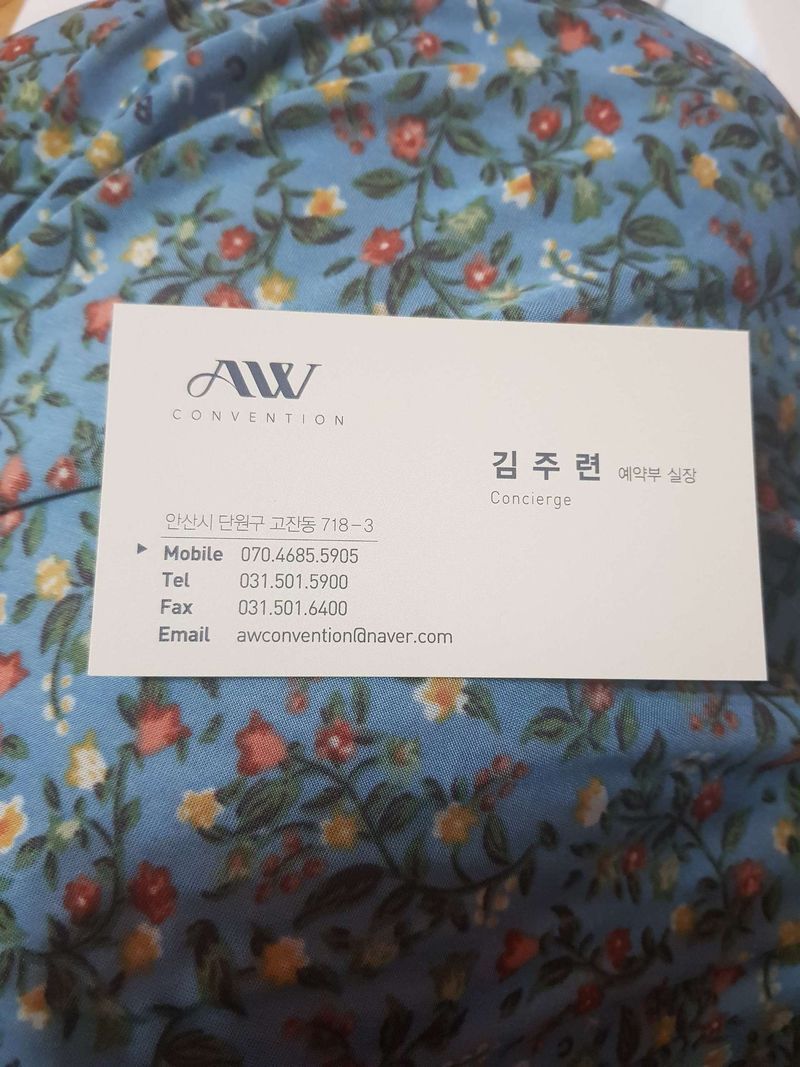6층 그랜드볼륨홀 당일 계약했습니다. 웨딩홀투어 때 처음으러 간 곳이었는데 aw가 웅장하고 화려하고 또 세련되서 다른 웨딩홀은 눈에 들어오지 않았어요!다른곳에 비해 좀 비싸고 서비스는 없었지만 웨딩홀과 음식이 평이 좋아서 바로 계약했습니다😊 홀분위기 : 추천♥ 호텔예식 느낌, 단독홀, 생화장식 등 너무 마음에 들어서 다름 웨딩홀은 눈에 안들어 왔어요 음식 : 추천♥ 시식은 아직 못해봤지만 지인들 이야기를 들러보니 다들 맛있고 안산에서는 음식 맛있다고 유명하다고 들었어요 서비스 : 상담해주신 분은 매우 친절하였고 다른 웨딩홀에 비해 서비스는 없었어요