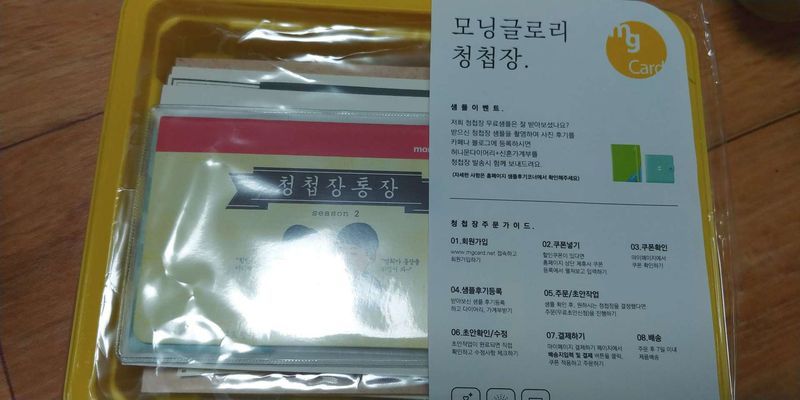 청첩장 신청시 주의사항이나 신청 방법등이 자세히 기재된 안내서가 통장 디자인으로 왔어요 너무 귀엽고 센스 있는것같아요! 디자인도 고급스러운거 귀여운거 등 다양한 방면으로 있고 같이 샘플로 주신 봉투도 예뻐요! 중간 사진에 집 더러운건 양해좀 해주세요ㅜㅜ 디자인 : 추천♥ 디자인이 다양하고 종이가 빳빳해서 잡았을때 질감이 좋았어요! 제가 고른 디자인들은 종이에 끼우는거(?)가 많았는데 종이가 워낙 빳빳하다보니 잘못하다간 찢어질수도 있을것같더라구요ㅜㅜ 가격 : 추천♥ 가격대가 높은것도 아니고 특히 할인률이 높기 때문에 그부분까지 고려하면 완전 최저가인것같아요 디자인도 다양해서 가성비 최고! 서비스 : 보통♥ 샘플 신청 후 바로 배송된것같아요 포장도 엄청 깔끔하고 예쁘게 되있는게 직원들의 노고가 보였습니다! 다만 따로 출고 후 연락이 없었던점이 좀 아쉬웠어요ㅜㅜ