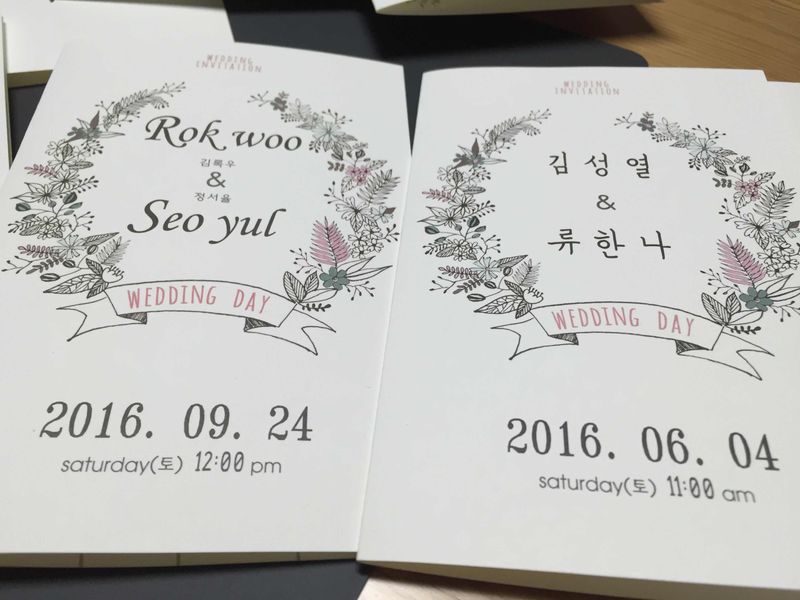 리프 프로젝트의 가장 큰 장점은 재생 가능한 종이, 콩기름 잉크, 그리고 기부입니다. 유지태김효진 부부의청첩장으로도 유명하지요. 의미있는 청첩장을 제작하고 싶으시다면 꼭 둘러보세요. 단 청첩장만의 우아하고 고급스런 느낌과는 거리가 머니 참고하세요. 디자인 : 추천♥ 날짜가 강조된 디자인, 본인 사진을 일러스트화하여 나타낸 디자인, 상징이 되는 문구나 이름만 간략히 쓰인 디자인 등 다양하지만 청첩장 보통의 깔끔하고 우아한(실크같은) 느낌은 없습니다. 가격 : 추천♥ 주문 매수가 100장 늘어나도 가격은 1000원씩만 올라요. 개신 할인의 개념이 없습니다. 그럼에도 이 곳을 선택한 이유는 재생 가능한 종이와 콩기름 잉크를 사용한 봉투를 쓰기 때문이고, 청첩장을 구매하면 1%를 위안부할머니께나 국가유공자에게 기부할 수 있기 때문이었습니다 서비스 : 보통♥ 속지의 구성이 알차고 깔끔해서 크게 수정은 없었지만 표지 그림이나 글씨 크기, 청첩장 문구 등을 세밀하게 수정요청 하였는데 빠른 답변과 처리로 만족했습니다. 다만 수정이 들어가면 메일이나 문자로 연락이 온다고 했는데 빠른 연락이 오지 않아서 제가 사이트를 들어가 보니 수정이 돼 있고 한 경우가 있었어요 TIP : 여기에서는 마음에드는 디자인에 원하는 캘리그라피를 선택할 수 있거나, 자신이 가진 사진을 일러스트로 바꾸는 등 다양한 적용 및 변경이 가능했어요. 제가 최종 선택한 청첩장에서는 배경 꽃을 빼고 문구를 바꾸는 등 세부 수정이 가능해서 좋았습니다.