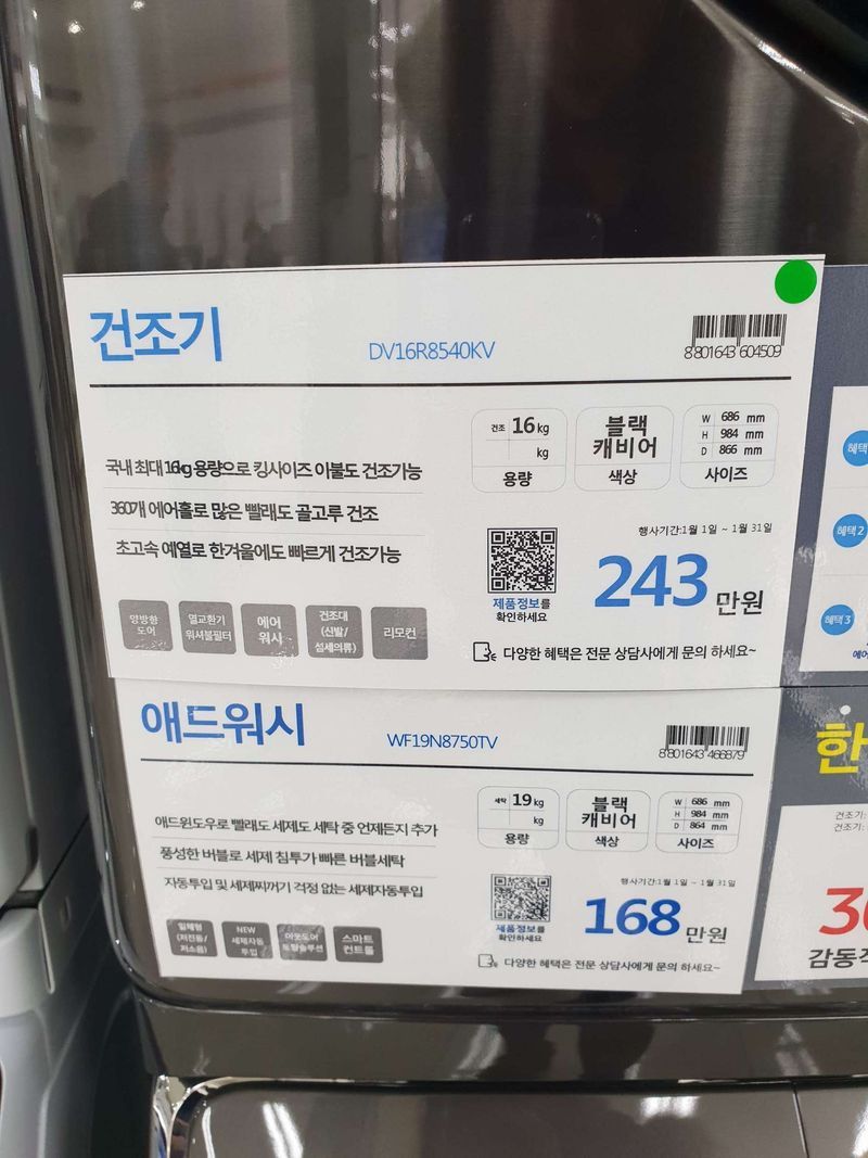 건조기랑 세탁기를 직렬로 설치하여 사용할 예정이에요~ 넘 기대됩니다 상품 : 추천♥ 그랑데건조기, 애드워시 세탁기, T9000냉장고에 대한 상담을 진행했어요 가격 : 추천♥ 건조기, 세탁기, 냉장고, 공기청정기 합하여 700만원대의 견적이었는데 할인 및 상품권 페이백 사은품 증정 통해 500만원대 후반의 견적을 주셨어요 서비스 : 추천♥ 혼수 담당 상담사분이 굉장히 친절하셨고 차분하게 제품의 특징과 다른 모델과의 차이점 설명해주셨어요~