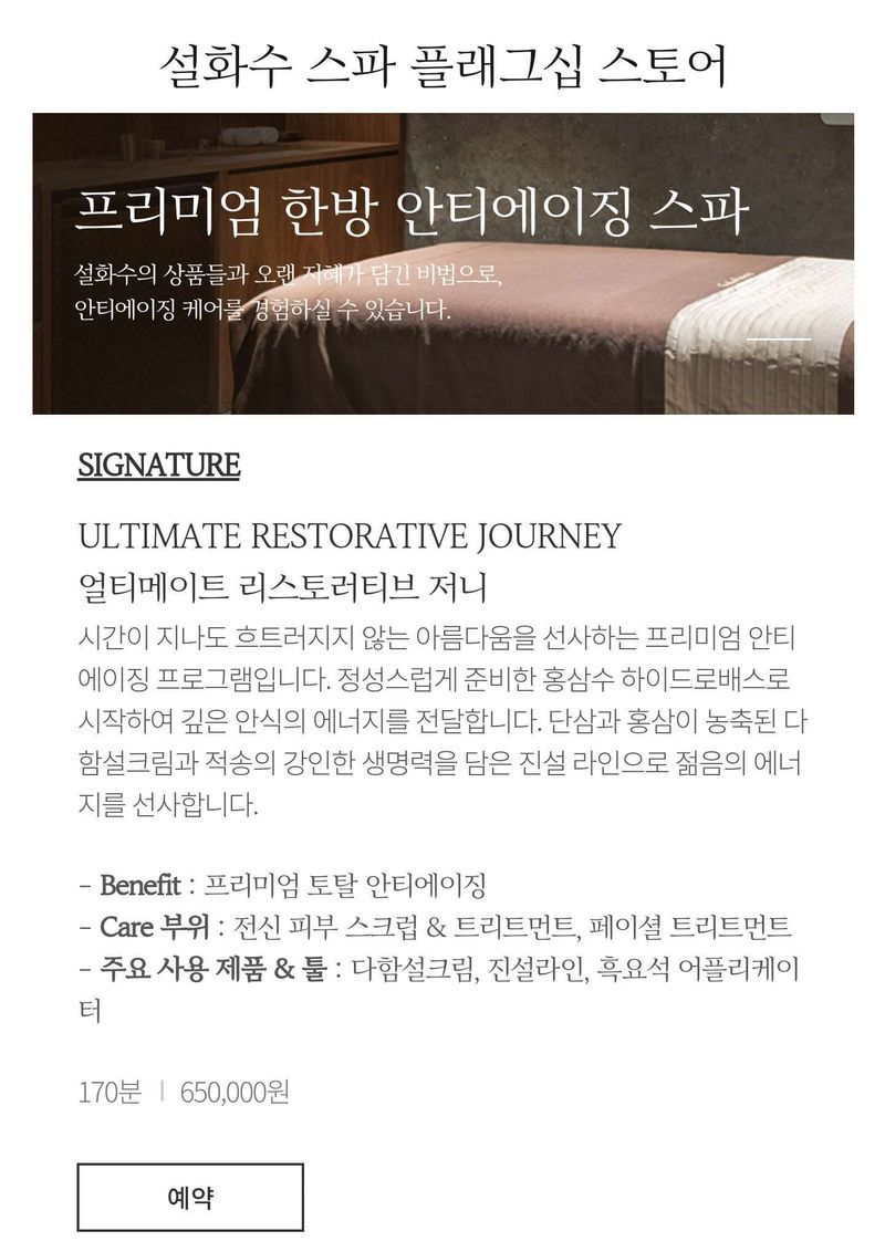 스파체험공간이 플래그십스토어에 생겨서 엄청 기대가 됩니다!! 저렴한금액대는 아니지만 설화수라인자체가 고급지고 그만한 이유가 있기때문에 스페셜하게 이용하기에 좋을 것같아요!무엇보다도 여자들은 옷입고 단장하기 좋아하는데 설화단장이라고 전통복체험존이 있는게 기대됩니다!우리나라 한복도 여러가지로 입어볼수있는 있다는 것이 기대되요! 그 외에 설화수에서 나온 차와 예단포장서비스와 피부상담도 가능해서 예약만 한다면 하루 데이트도 가능할 것 같다라는 생각도 듭니다! 상품 : 추천♥ 설화수 플래그십 스토어는 스파체험및 뷰티서비스와 전통한복체험이있는 공간으로 너무나 기대되는 곳이예요!!! 가격 : 추천♥ 스파케어는 프리미엄전신케어부터 페이스케어만 받을 수도 있고 전부다 살화수라인으로 케어되는데 이것또한 너무 기대됩니다!!설화수 좋은건 이미 사람들이 알고있고 한가지도아니고 여러제품을 체험해 볼 수있는 공간이 있는게 좋은 것같아요~데이트 장소로도 좋을 것 같지만 미리예약하고 가야해서 시간 맞춰야될 것같네요! 서비스 : 추천♥ 백회점보다 친절하다면 두 말은 잔소리죠!!