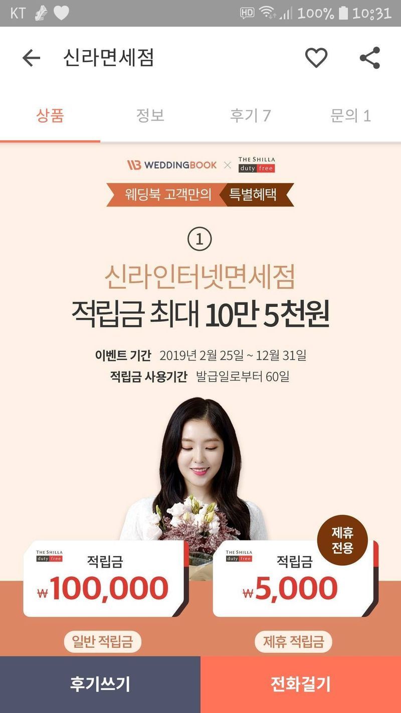 신랑에게 선물로 시계를 주려고 생각 중이었어요~ 웨딩북보다가 신라면세점 적립금 혜택을 보고 바로 신청했습니다.^^ 선착순일까봐 사용기간이 있는 것도 못보고 발급을 받아 속상하지만.. 결혼 전 가까운 곳이라도 다녀와야겠어요^^;; 그래도 덕분에 시계를 잘 구입할 수 있을 것 같아 행복합니다.^^ 상품 : 추천♥ 신랑선물로 시계구입예정이에요^^ 적립금으로 알차게 살 수 있을 것 같아요.^^ 가격 : 추천♥ 면세점에서 구입하려고 생각중이었는데, 웨딩북에서 적립금을 주는 혜택이 있어 바로 신청했습니다^^ 서비스 : 추천♥ 적립금으로 저렴하게 구입할 수 있을 것 같아요.^^