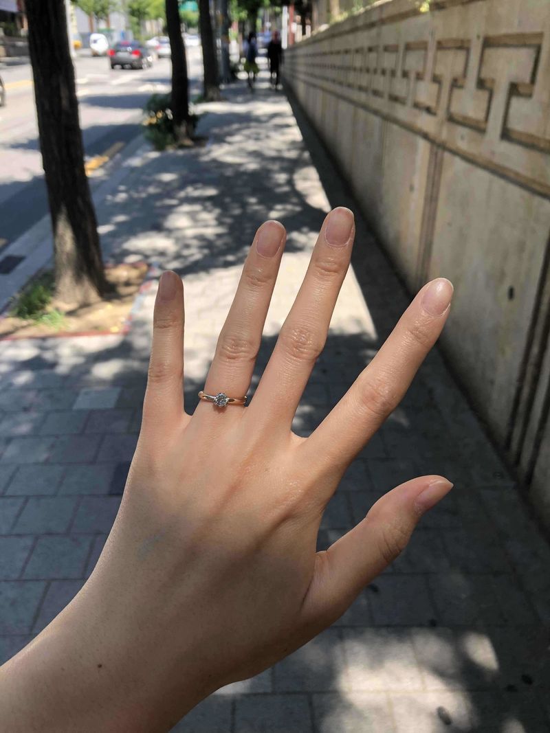 저는 솔직히 다이아가 뭐 그리 대단하냐 생각하던 사람입니다ㅋㅋ 근데 달라요..정말 다릅니다.. 그 반짝임때문에 하루 종일 반지만 보고 있는 기분이네요 햇빛있는 곳에서는 진짜 눈부실 정도구요 ㅠ_ㅠ 그리고 뻔한 디자인이 아니라 투톤으로 제작 가능한 점도 너무 좋았고, 링하고, 받침, 다이아가 전부 어우러지는 느낌이라 더더욱 좋았습니다. 함께주신 브라운 케이스도 진짜 느낌있구요 무엇보다 그자리에서 그순간 사이즈 체크하고 끝이 아니라 밤, 낮을 다 사이즈링으로 체크해보고 결정하게 해주셨던 점이 가장 좋았습니다. 그 결과, 제가 아침에 굉장히 붓는다는 사실을 깨닫고, 상담때 잰 것 보다 0.5 크게 제작하게 됐구요 지금은 너무나 잘 착용하고 있습니다!! 말보다는....사진이죠 영상도 올리고 싶네요 반짝임 ㅠㅠ 디자인 : 추천♥ 심플하고 영롱해요 심플한 밴드 위에 너무나 반짝이는 다이아가 올려진 느낌입니다ㅠㅠ💕 투톤이라는 점이 너무 맘에 들었구요, 다이아를 받쳐주는 부분이 샴페인 골드인데 다이아가 더 커보이기도 하고 확실히 더 빛나게 해주는거 같아요>_< 품질 : 추천♥ 다이아몬드 감정서를 같이 주시는데 등급이 골고루 엄청 높은 편입니다 '-'* 투명도가 엄청 높았구요 주변에서도 '새거는 다르다'라고 말할 정도로 반짝임이 돋보여요 자꾸 자꾸 보고 싶은 다이아 입니다!! 서비스 : 추천♥ 깜짝 프로포즈로 이 반지를 받았는데 프로포즈용은 대여해주셨다고 해서 그 부분도 넘 감동적이었구요, 다음날 바로 매장에 가서 사이즈도 맞추고 투톤 컬러를 어떤걸로 할지도 직접 고를 수 있었어요! 골드도 브라운, 옐로우, 샴페인, 화이트 이렇게 다양한 컬러가 있어서 직접 다 착용해봤구요, 더 섬세한건 같이 밖으로 나가서 자연광에서는 어떤지 느낌 비교도 해주셨어요!!! 무조건 화이트나 실버만 하던 제가 브라운 골드를 선택하게 됐답니다 ㅎㅎ 사이즈는 며칠동안 밤낮으로 비교해보라고 사이즈링을 선물로 주셔서 정말 고심하고 골랐더니 너무 편하고 딱 예쁜 사이즈로 잘 골라진 것 같네요 💕