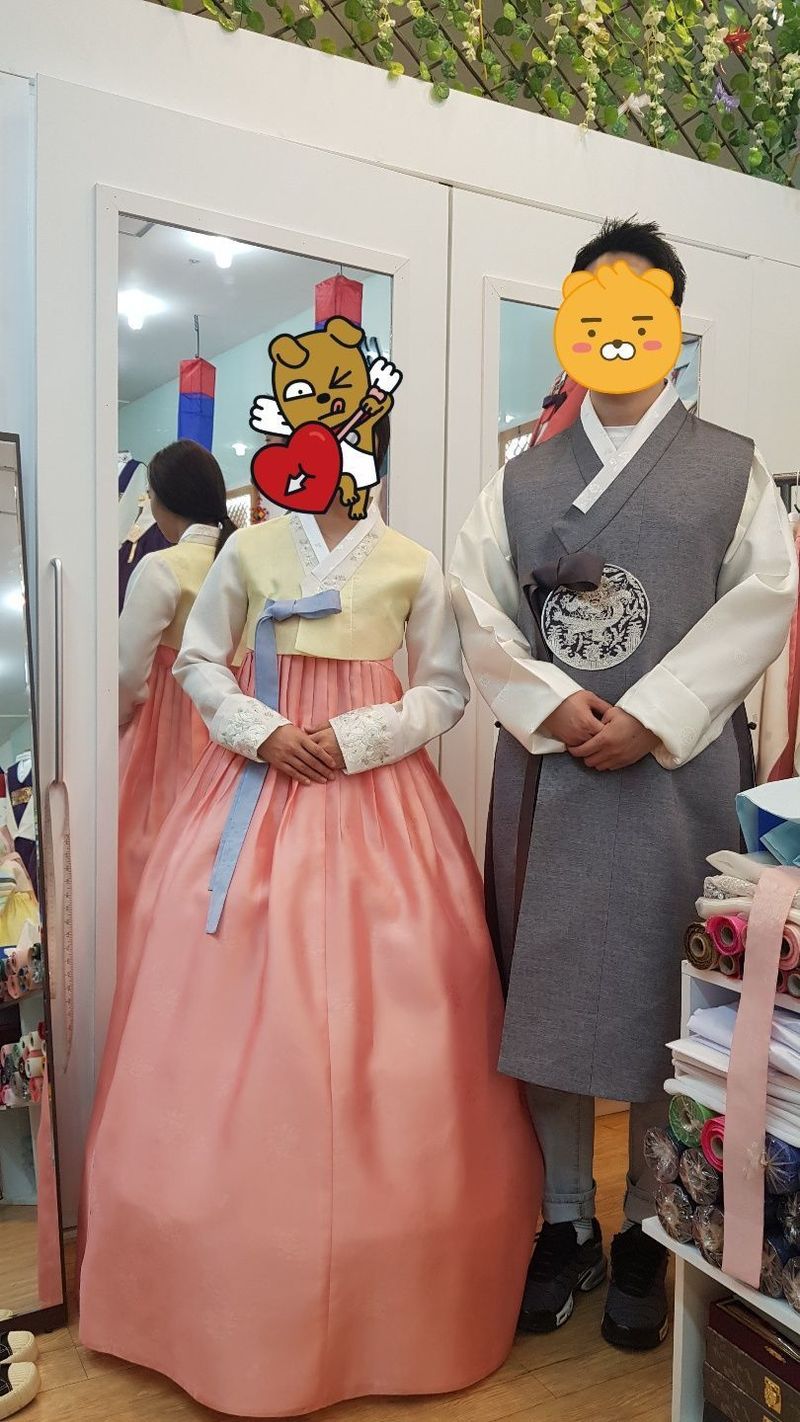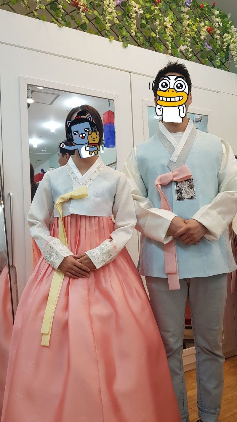 저희는 3번째 사진 커플한복으로 했어요~ 그레이는 신랑이 멋있어보였지만 커플느낌이 나지 않아서 포기했어여 ㅎㅎ 색도 넘 예뻐요 ❤ 스타일 : 추천♥ 파스텔톤의 한복이 참 예뻤어요! 사진도 찍어주셨는데 예쁜게 담기진 않네여 !! 역시 눈으로 보는게 젤 이뻐요~ 저희 옆에서 다른 분 혼주한복 보시는데 혼주한복도 고급스럽더라구여 ㅎㅎ 저희는 혼주한복을 집근처에서 해서 넘 아쉬웠어여 ㅠㅠㅠ 품질 : 추천♥ 금액이 저렴한데 퀄리티가 저렴해보이진 않아서 더 좋았어여 👍 피로연때만 입을 생각으로 비싼건 보지않았구 합리적인 가격 (신랑 신부 18만원)으로 두벌 빌렸네여 ㅎㅎ 웨딩북에 나와있는 금액 그대로여서 짱!!! 맞춤도 아닌데 피팅하기전에 치수 다 재주시고 제 몸에 맞는걸로 입혀주셔서 감동.. ❤ 서비스 : 추천♥ 저희를 상담해주신 분은 알고보니 원장님이셨어요 ❤ 반말로 응대하시는데 저는 별로 신경쓰지 않는 편이라 예민하신 분들은 불쾌하게 느끼실수도 있어여! 오히려 엄마같이 친근해서 좋았어여 ㅋㅋ 원래 머리장식은 안빌려주시는데 제가 빌려달라고 졸라서 같이 보내주신다 했어여~ 굳이 찾으러가지 않고 택배로도 받을 수 있어서 편리한거같아여 !