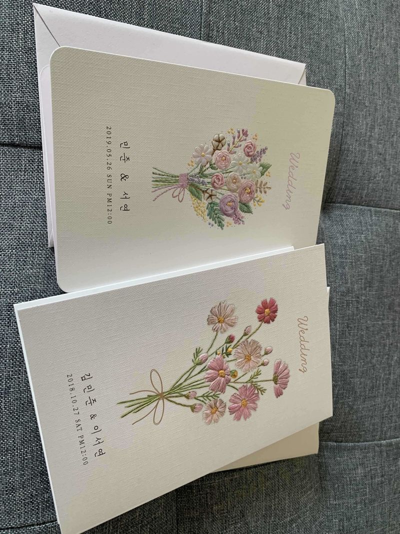 세곳정도 샘플을 받아봤는데 보자기카드가 가장 마음이 들었습니다. 종이 품질도 그렇고 전 꽃이 들어간 디자인을 원해서, 꽃이 들어간 디자인 제품들로 봤는데 보자기카드가 가장 고급스럽고 예뻤어요. 두개중에 고민하다가, 가을 결혼이라 코스모스로 최종 진행했습니다. 디자인 : 추천♥ 디자인이 고급스럽고, 다른곳보다 예뻤어요. 가격 : 추천♥ 종이가 두껍고, 힘이있는종이라 고급스럽습니다. 흐물거리지않아요!! 서비스 : 추천♥ 빨리빨리처리되서 좋았습니다. 일정에 맞춰 줘야해서, 빠른제작 서비스를 이용했는데 비용은 있지만 원하는 일자에 받았습니다.