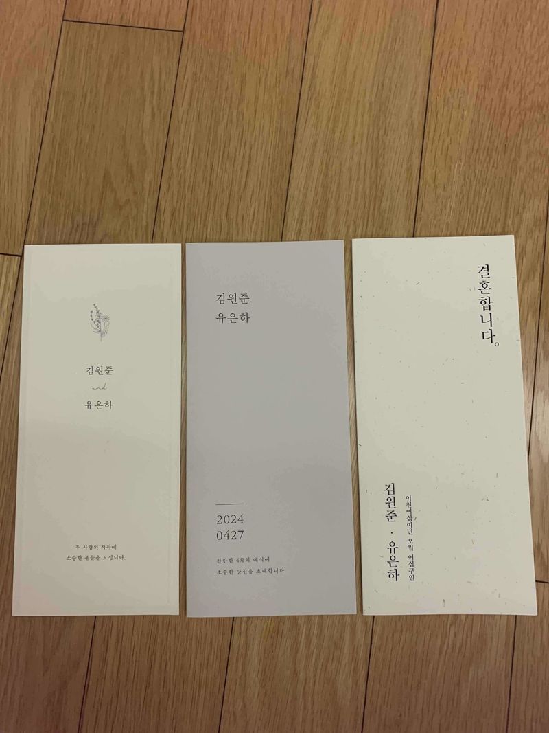 일단 샘플 받아보면 종이 질감부터 다르다는 걸 알 수 있어요 그리고 깔끔한 디자인에 본인 취향에 따라 프리저브드 꽃을 매치할 수 있어서 좋아요 디자인 : 추천♥ 다른데서도 샘플 받아봤는데 일단 종이 퀄리티가 달랐어요 깔끔한 디자인이 맘에 들었고 글씨체도 가독성이 있어서 좋았습니다 가격 : 추천♥ 가격이 타 상품대비 아주 싼건 아니었지만 품질대비 가격 만족입니다 서비스 : 추천♥ 디자인 회신도 배송도 빨랐어요 봉투가 몇 장이 불량이 있었는데 그것도 바로 다시 보내주셨어요 :)