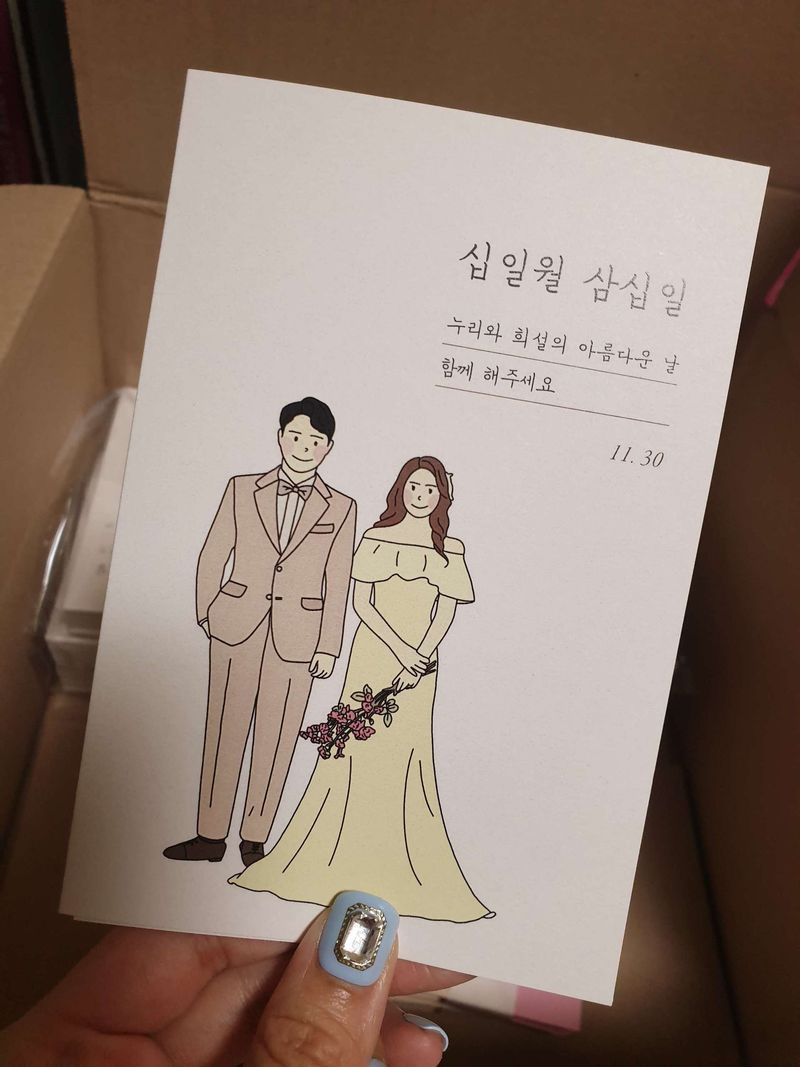 저희는 저희일러스트를 청첩장에 꼭 넣고싶었는데 예쁘게 잘 넣어주셔서 넘 만족스러웠습니다. 처음에는 DIY로 아예 제작하는걸 생각했는데 포토샵을 만지지못하면 쉽지않더라구요... 근데 사진자리에 일러스트넣는것만으로 우리만의 특별한 청첩장이 만들어져서 넘 만족스러워요^^ 그리고 뇌물로보내주신 여유분도ㅋㅋ 유용하게 잘 사용했구 무엇보다 무료로 받은 스탬프 진짜 예뻐요!! 봄카드에서 청첩장한거 넘 만족합니다^^ 디자인 : 추천♥ 여러곳의 샘플을 많이 받아봤는데 봄카드샘플이 마음에 드는게 제일 많았어요. 특히 일러스트나 사진이 들어간 청첩장이 디자인예쁜게 많더라구요 가격 : 추천♥ 저희는 청첩장 500매 ,스탬프도장, 식권도장 라벨지,잉크충전용2개까지해서 19만원정도 였어요 좋은가격에 종이질도좋았어요. 서비스 : 추천♥ 제가 사진자리에 일러스트넣는것 때문에 계속 문의했는데 항상 친절하게 답해주셨고 일처리도 빨라서 좋았어요:)