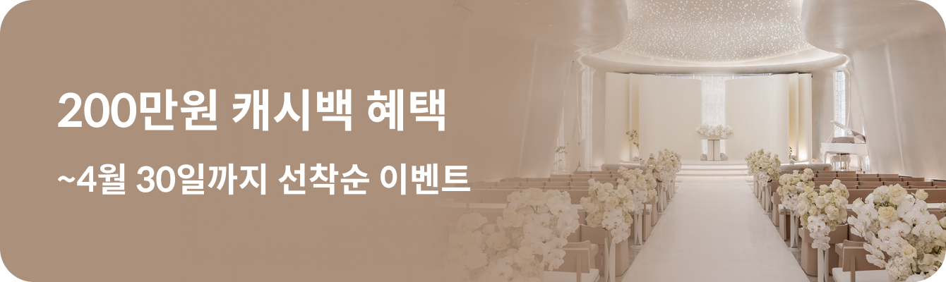 대상예식일 : 26년 4~6월 전 일정 : 26년 7~8월 일부 일정 : 27년 9~12월 일부 일정 혜택 : 200만원 캐시백 지급 - 캐시백 신청 후 예식 2주뒤 혜택 지급 - 신규 계약 고객에 한하여 적용 - 예식 일시 변경 및 지점 이동 시 혜택 지급 불가 - 타 컨설팅사를 통한 계약 시 혜택 지급 불가